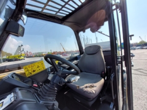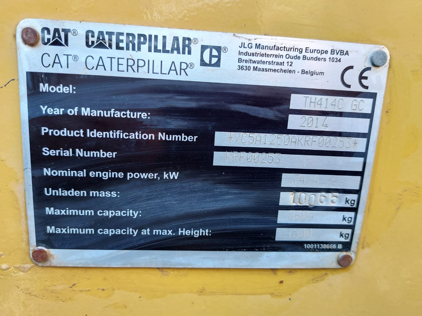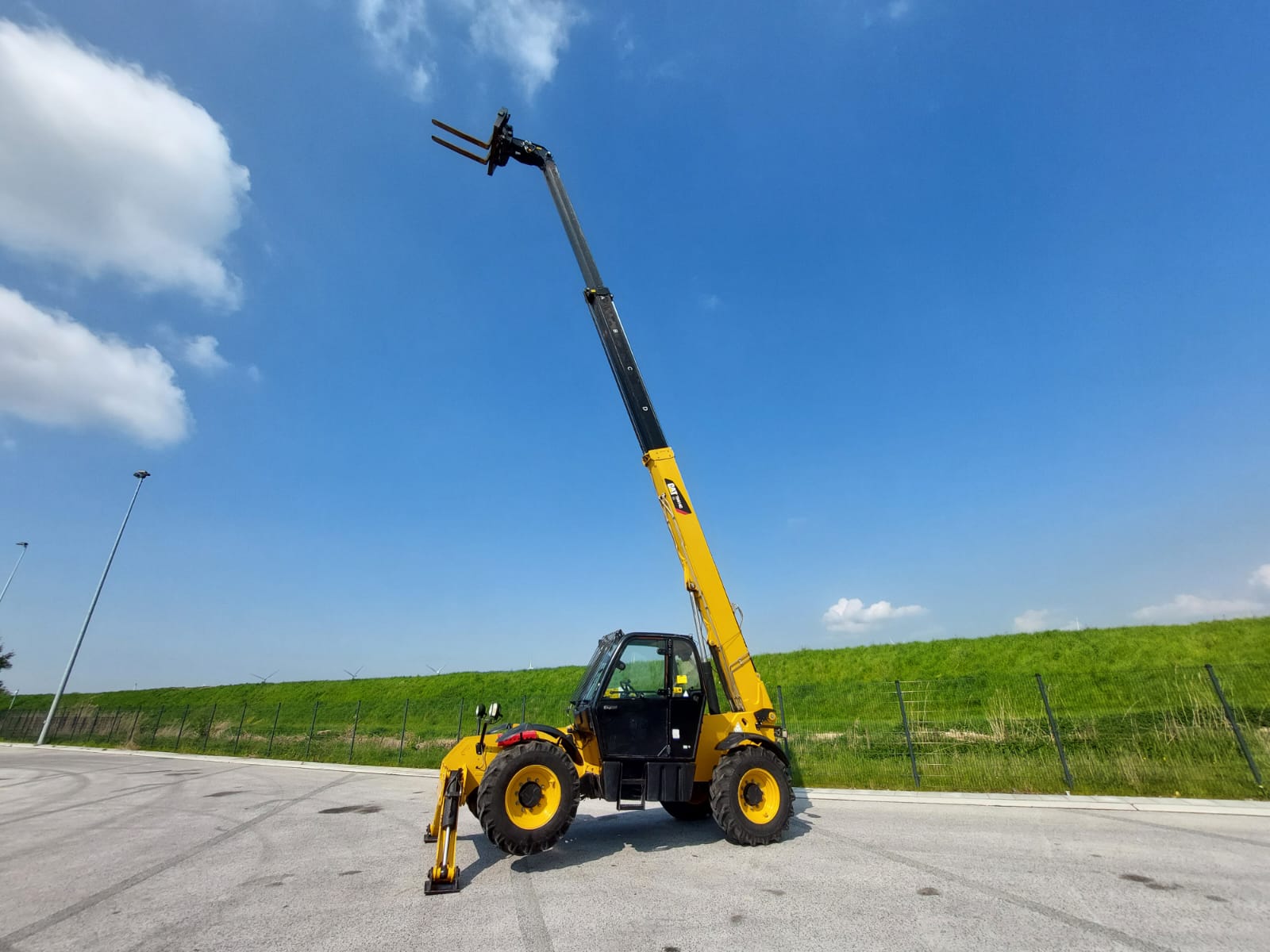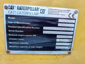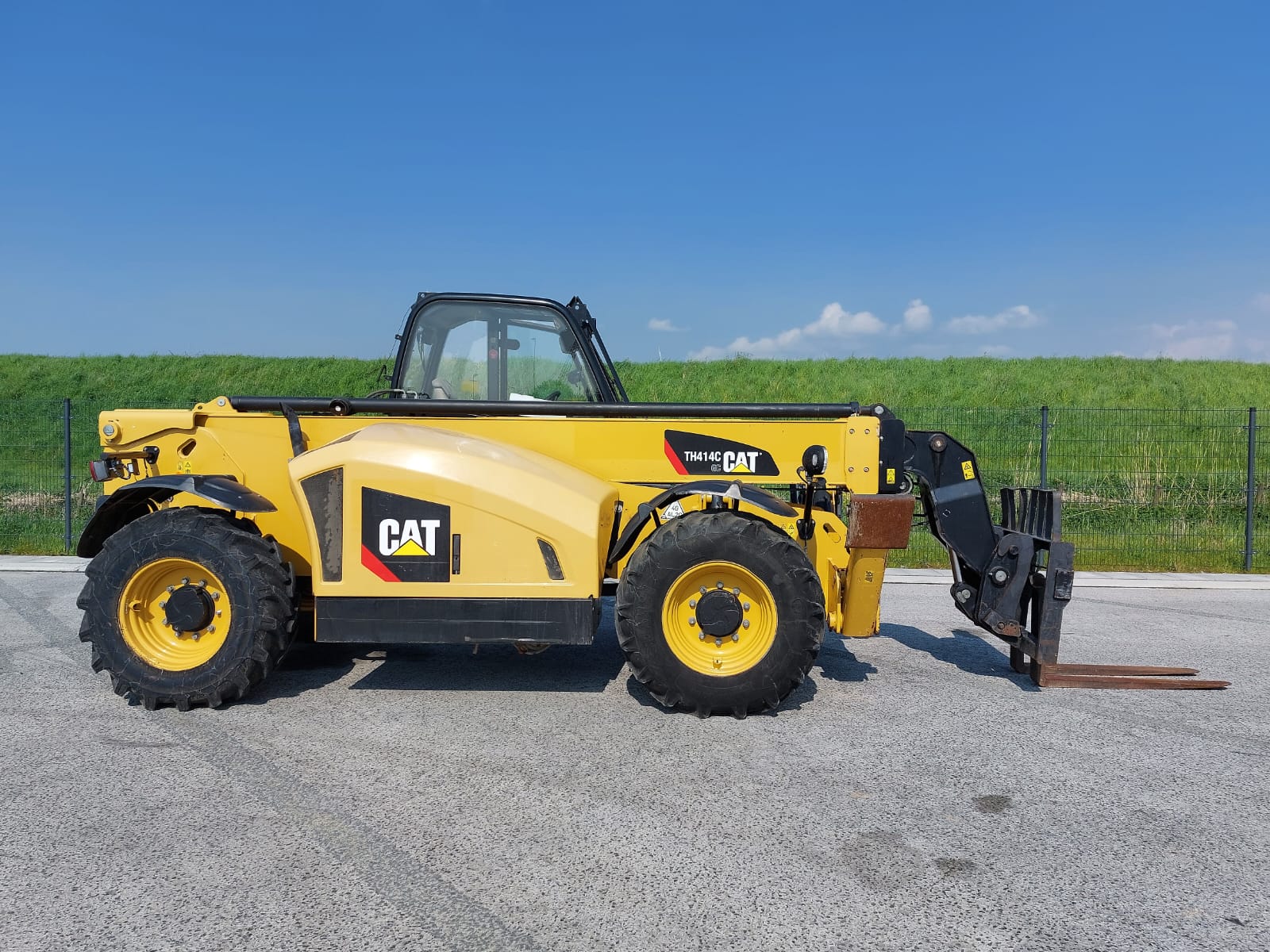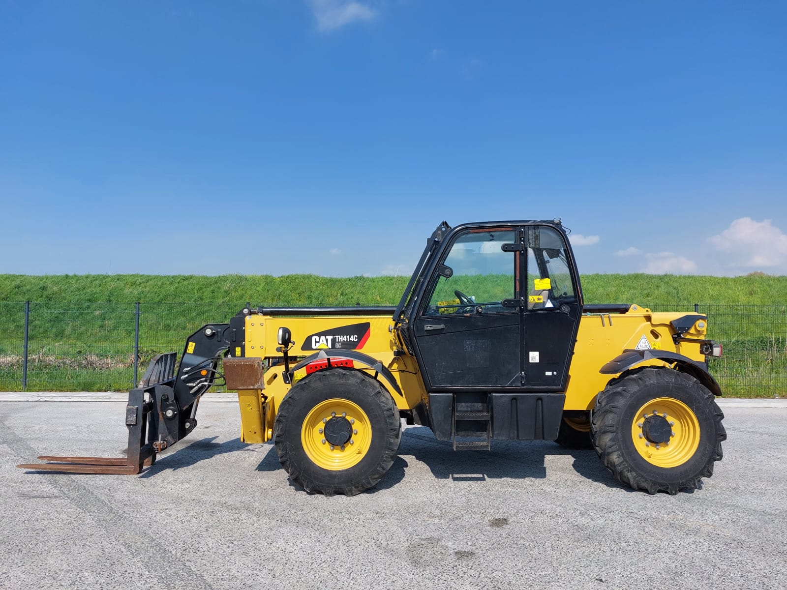 The Caterpillar TH414C is a telehandler, manufactured between 2012 and 2017, with a maximum lift height of 13.7 meters (44.9 feet) and a nominal load capacity of 3.7 tons (8,157 lbs). It is designed to handle various materials on a busy site.