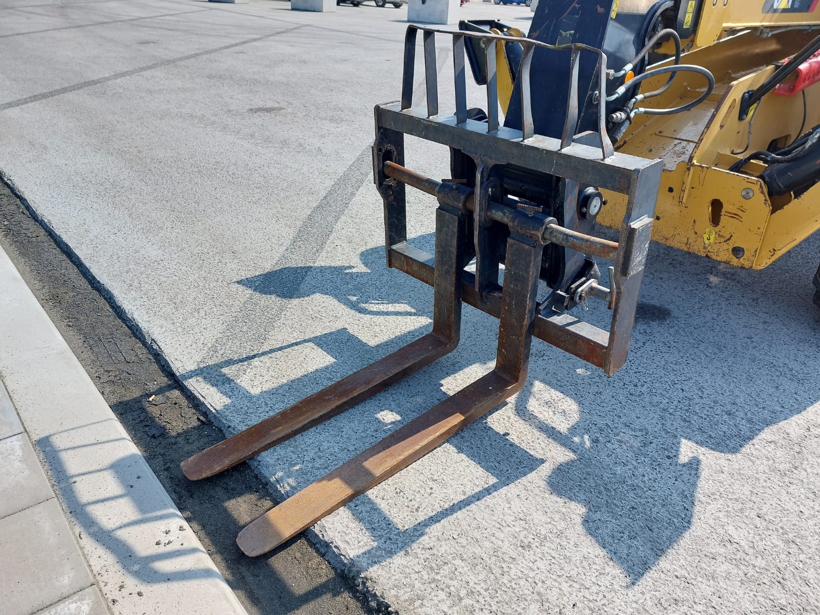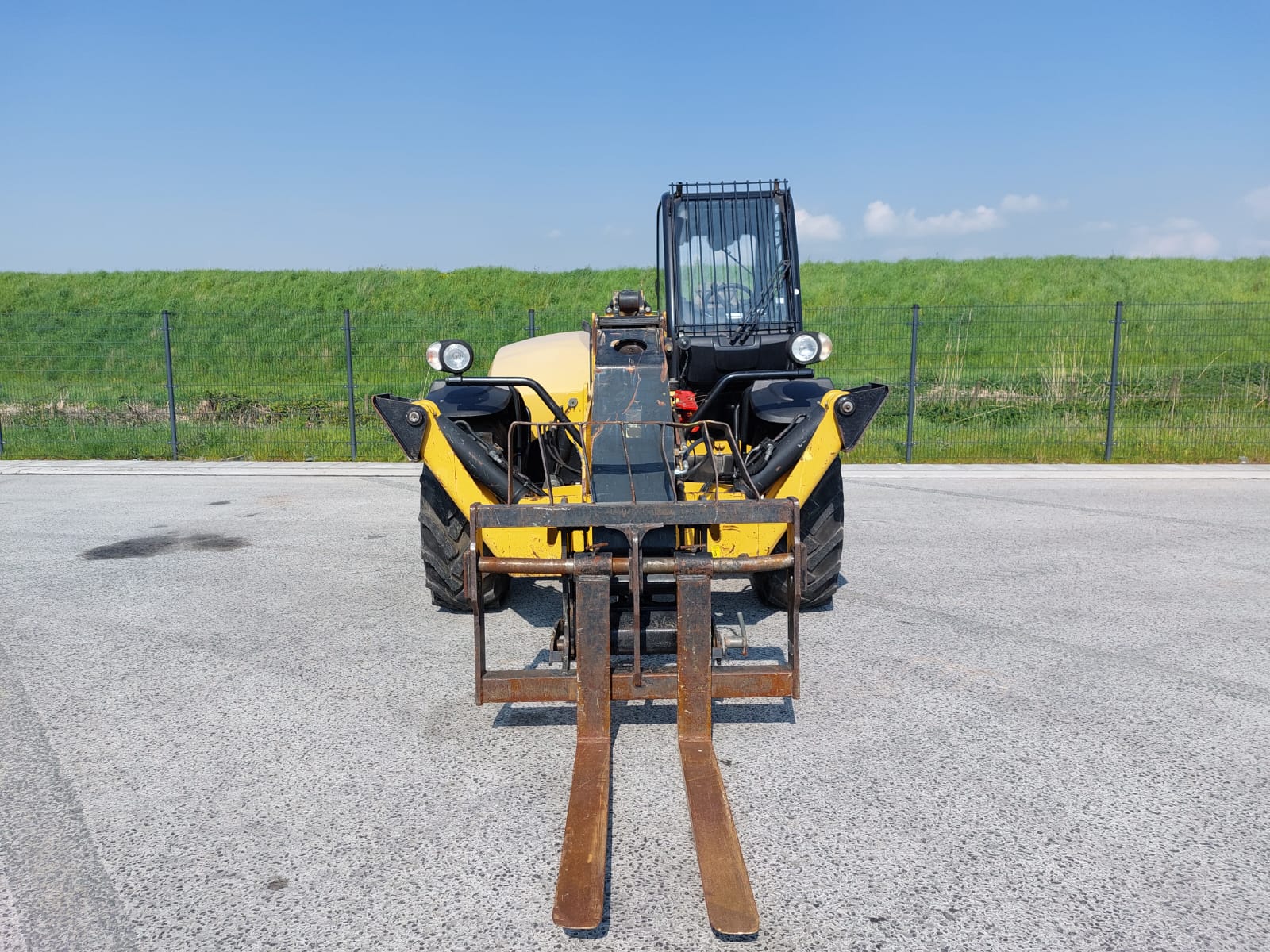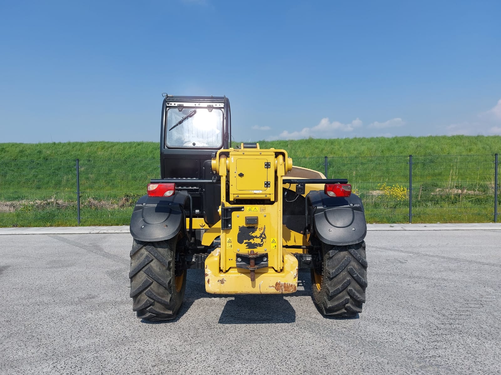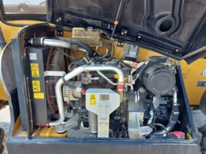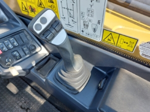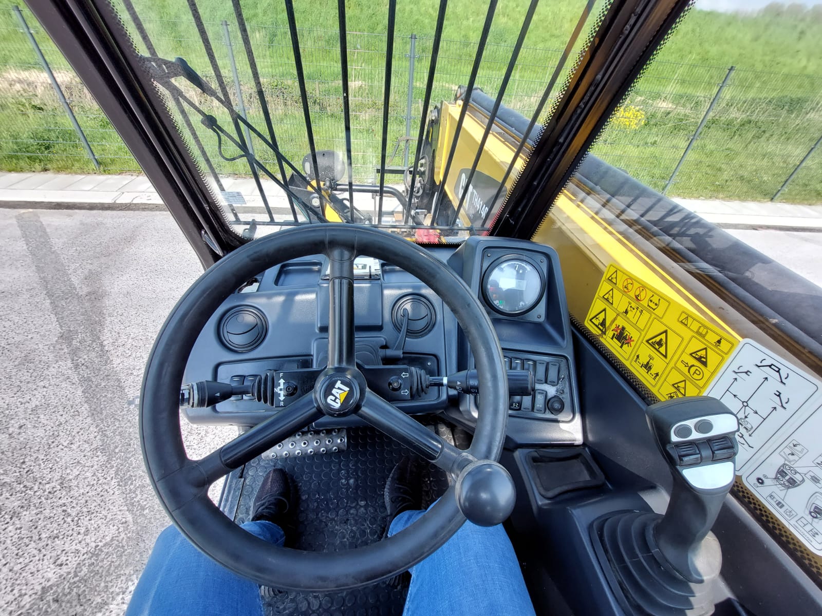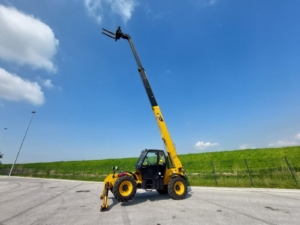 The Caterpillar TH414C is a telehandler, manufactured between 2012 and 2017, with a maximum lift height of 13.7 meters (44.9 feet) and a nominal load capacity of 3.7 tons (8,157 lbs). It is designed to handle various materials on a busy site.