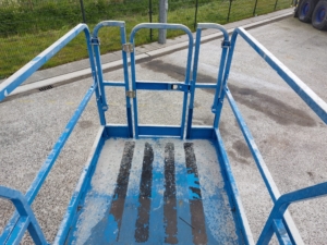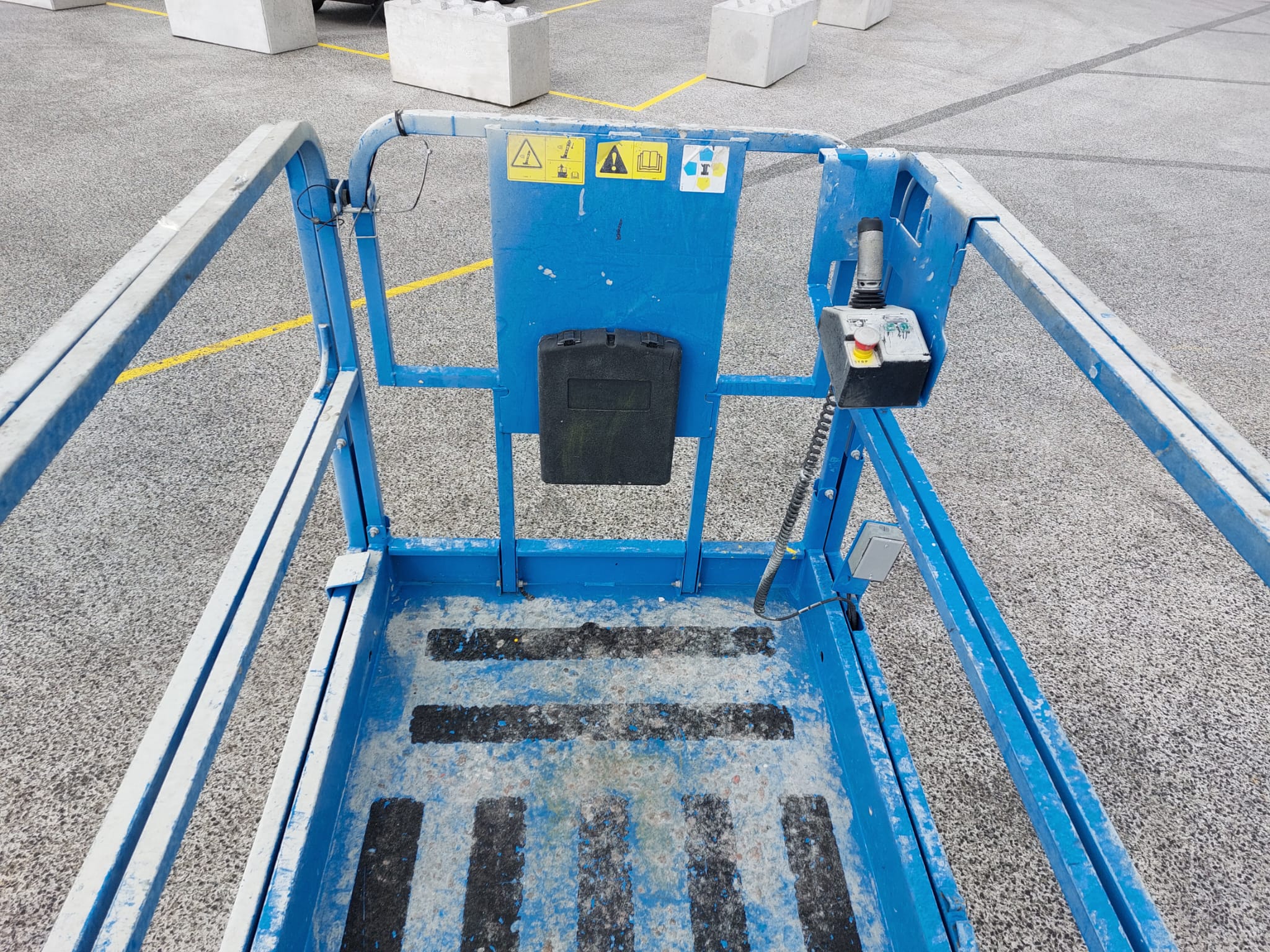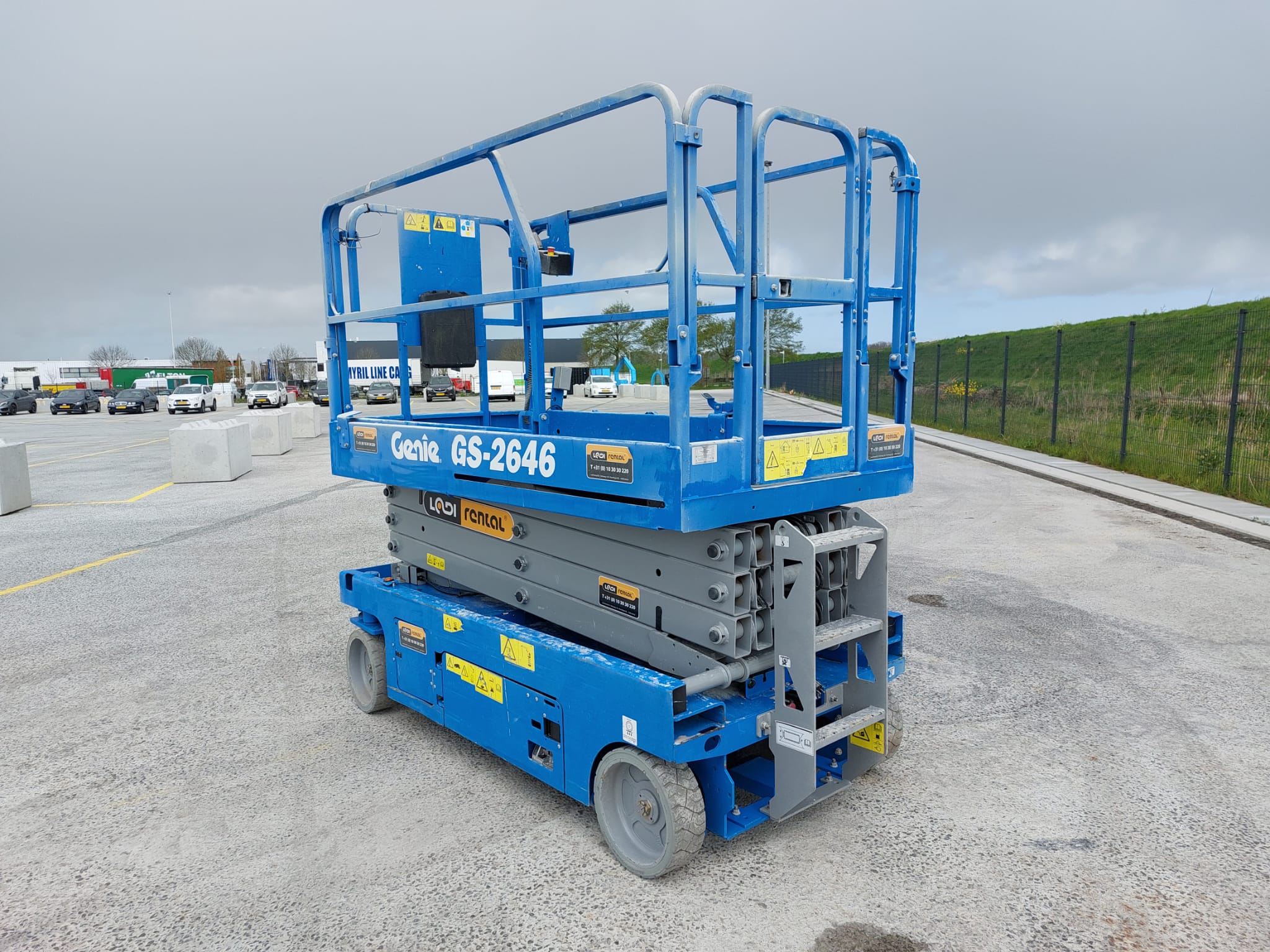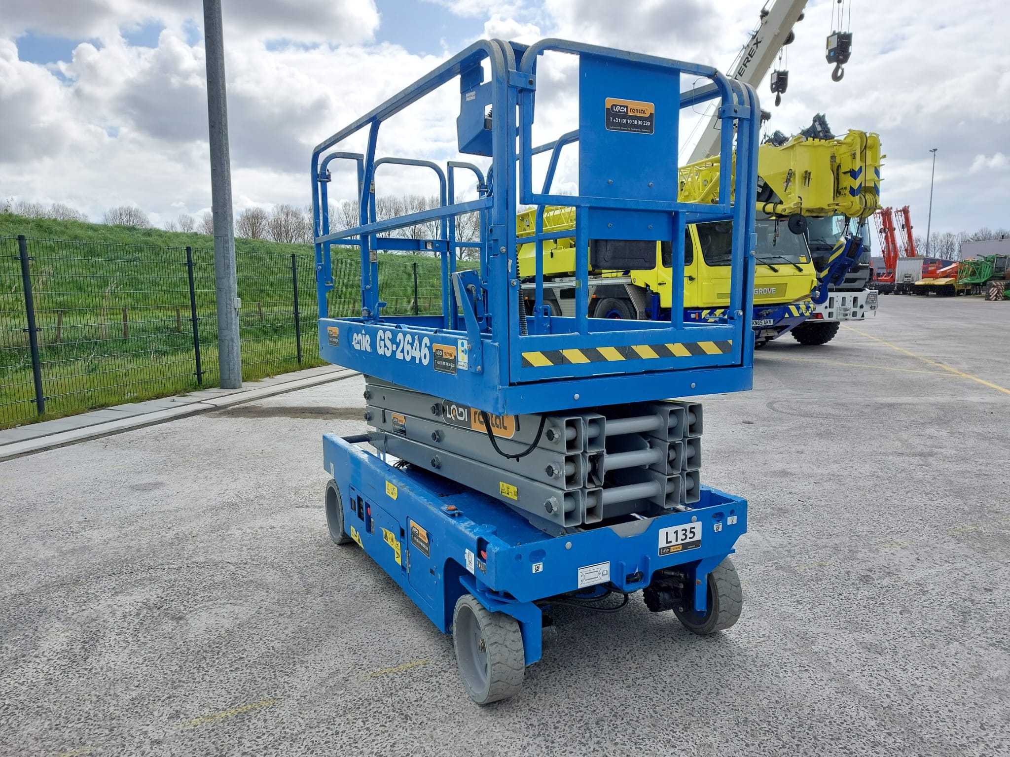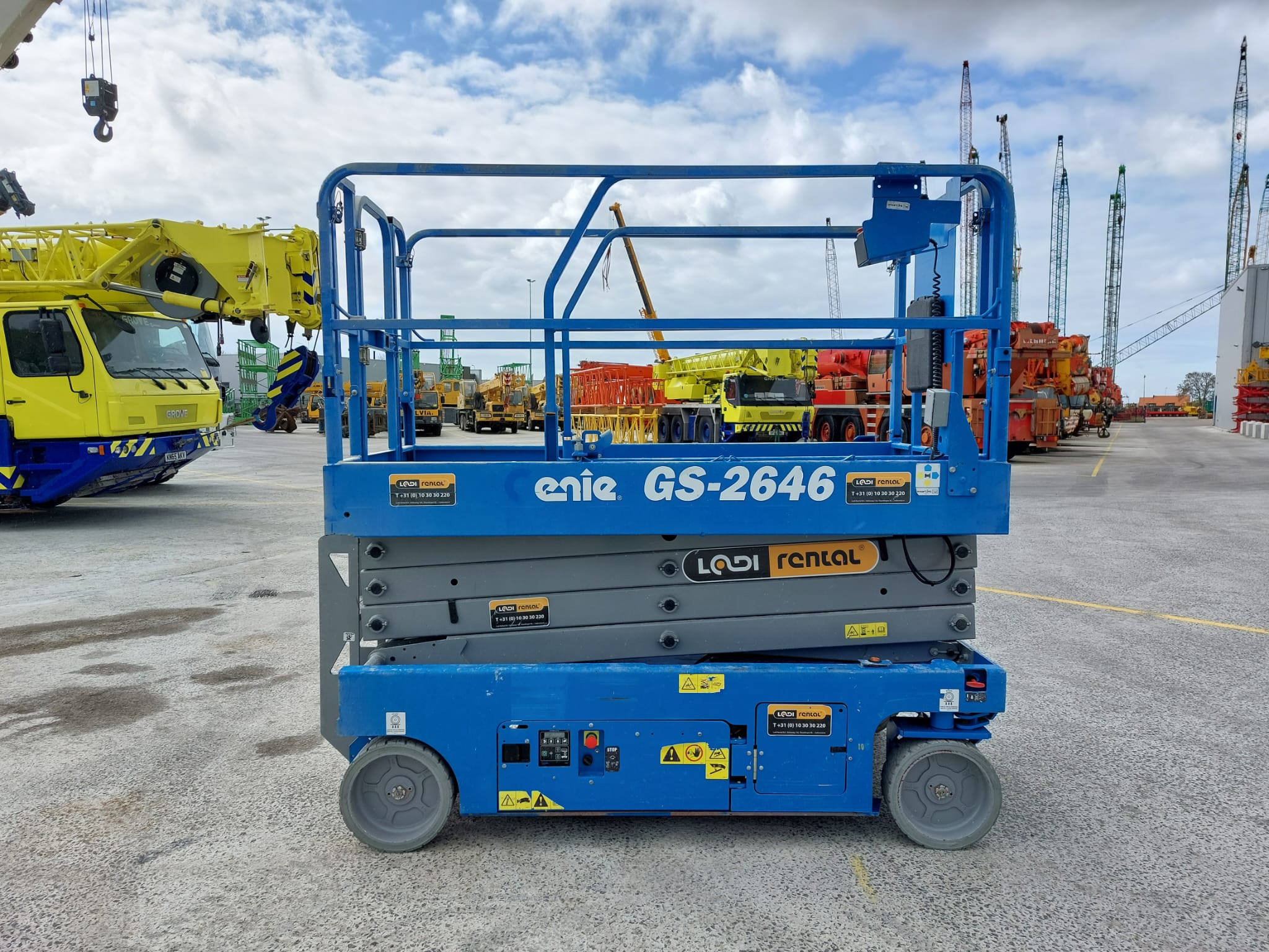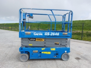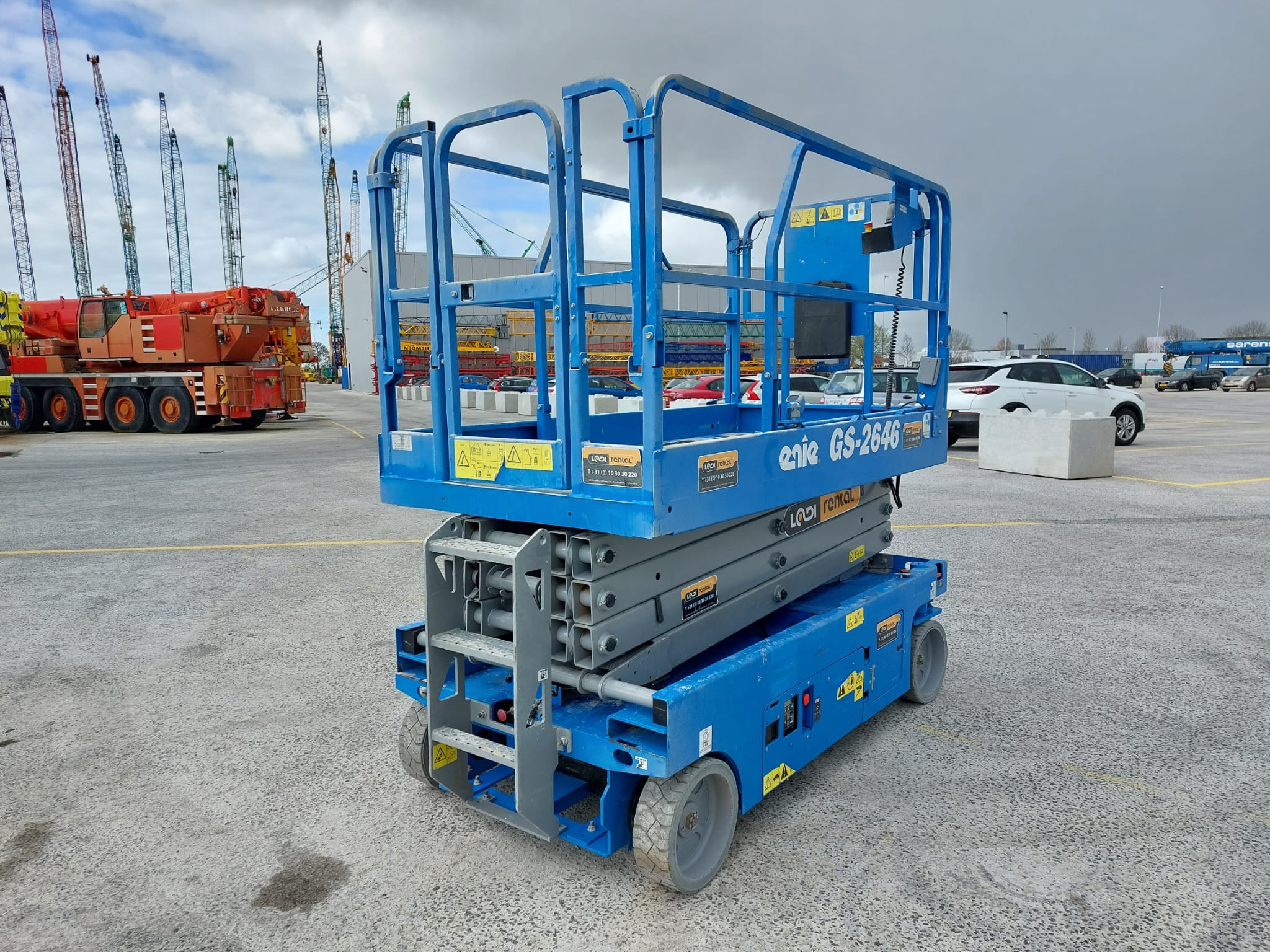 The Genie GS-2646 E-Drive Scissor Lift is an electric slab scissor lift known for its powerful AC electric drive motors, quiet, zero-emission operation, and front-wheel drive with zero inside turning radius. It has a maximum working height of approximately 32 ft 1 in (9.96 m) and a platform capacity of 1,000 lb (454 kg).