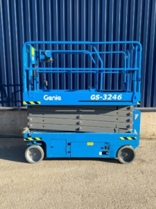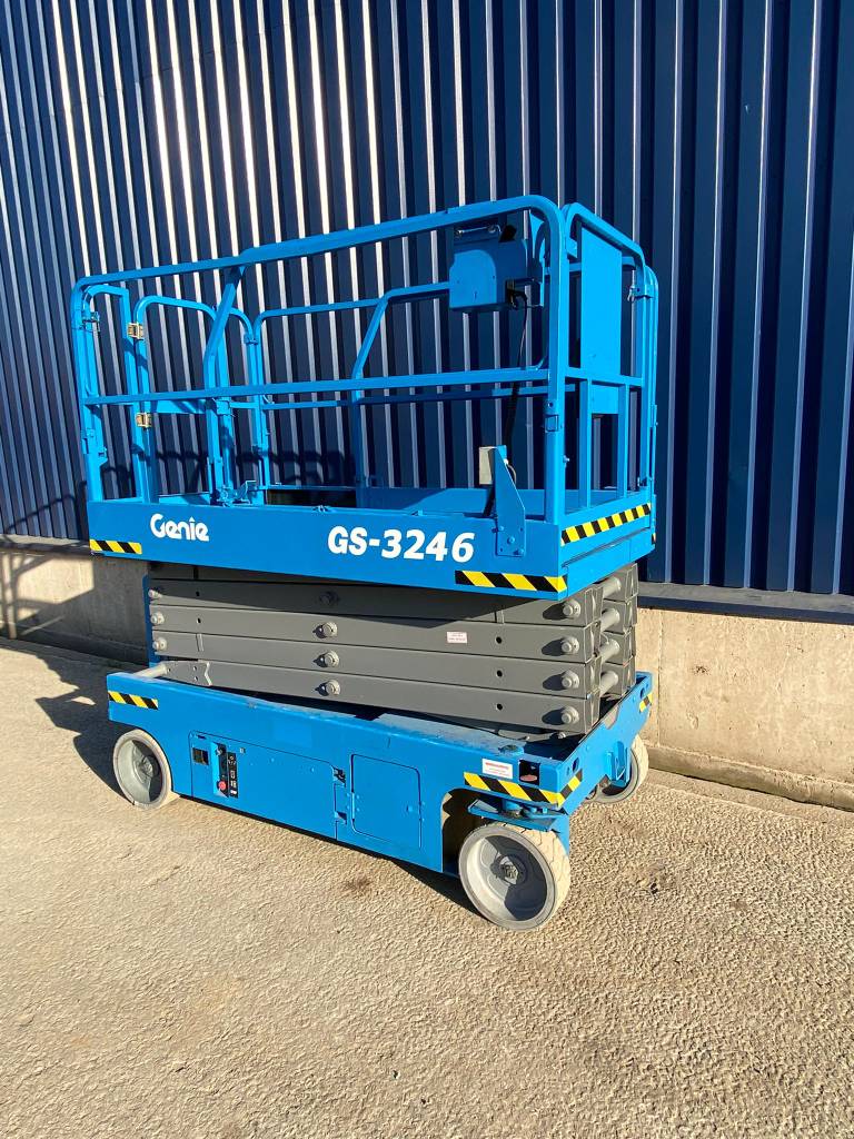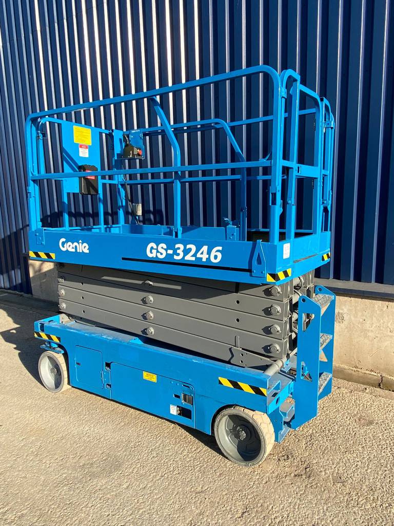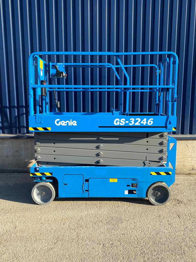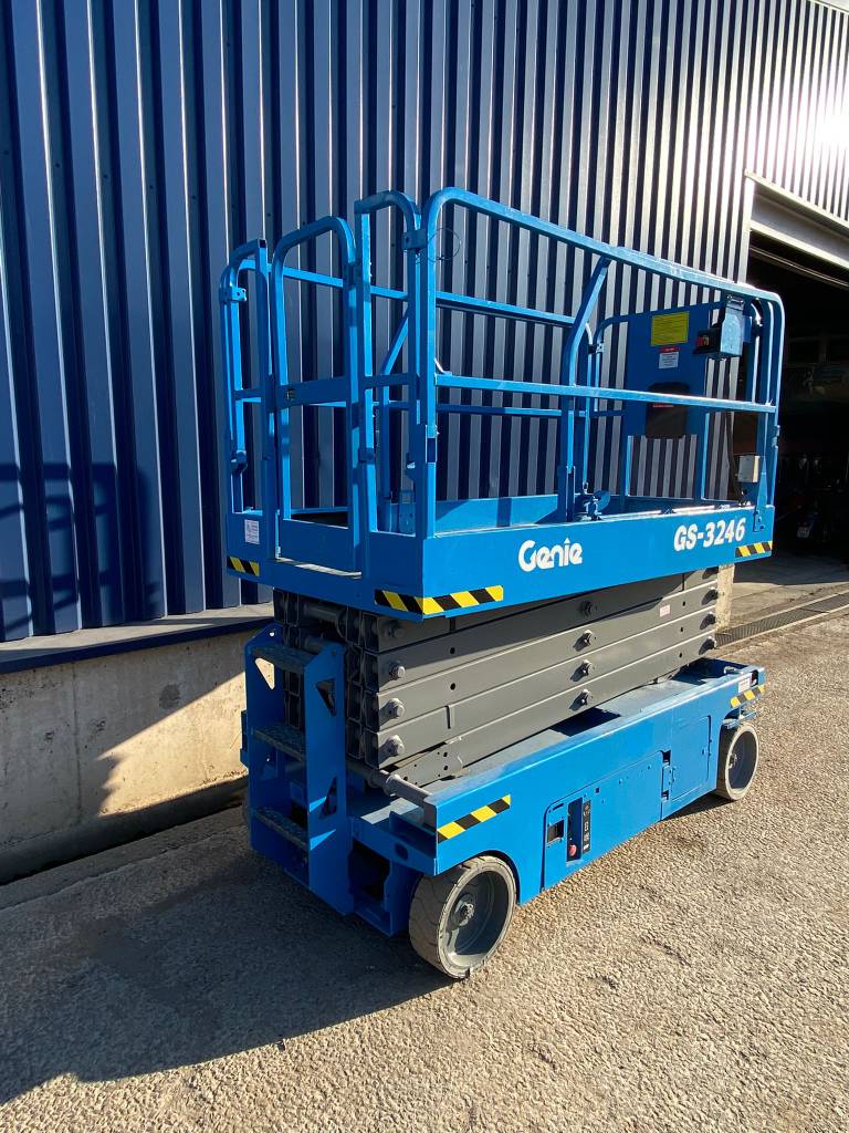 The Genie GS-3246 E-Drive is a slab scissor lift known for its quiet, zero-emission electric operation and powerful AC electric drive motors, offering industry-leading runtime. It has a maximum working height of 38 ft 1 in (11.78 m) and a platform capacity of 700 lb (318 kg), making it maneuverable in tight spaces and capable of fitting through standard double doors.
