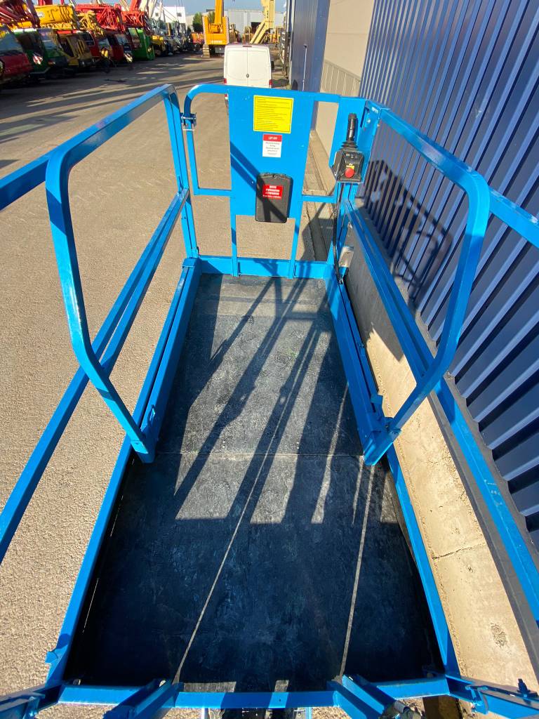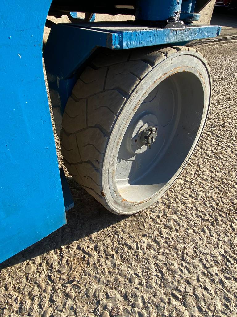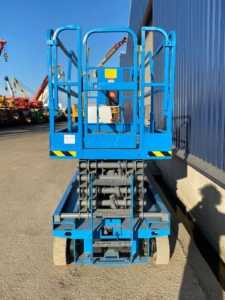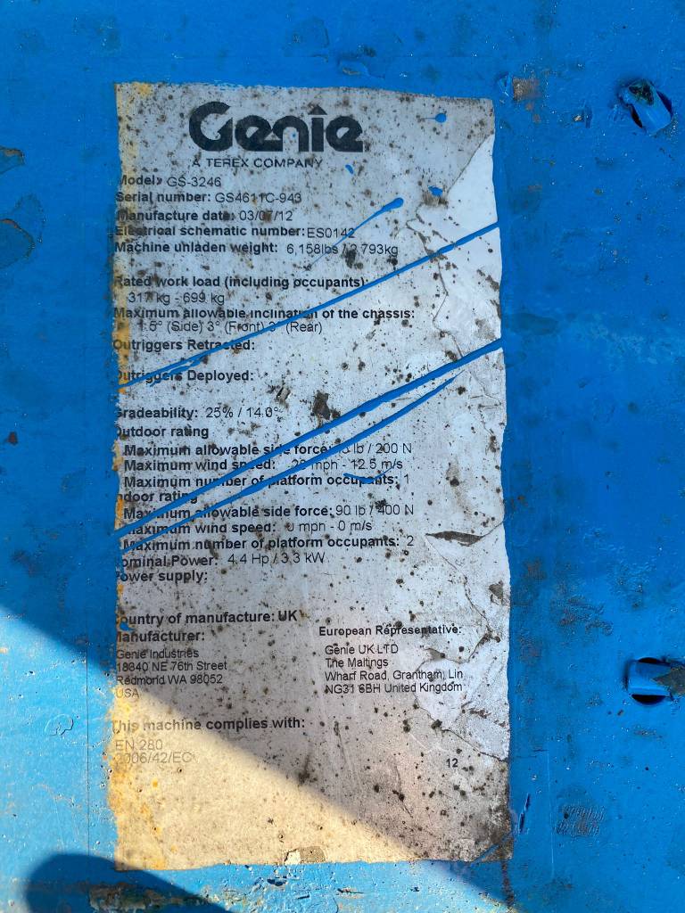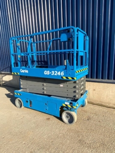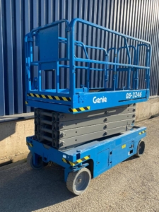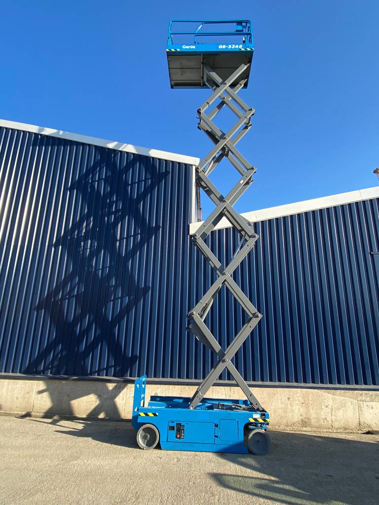 The Genie GS-3246 E-Drive is a slab scissor lift known for its quiet, zero-emission electric operation and powerful AC electric drive motors, offering industry-leading runtime. It has a maximum working height of 38 ft 1 in (11.78 m) and a platform capacity of 700 lb (318 kg), making it maneuverable in tight spaces and capable of fitting through standard double doors.