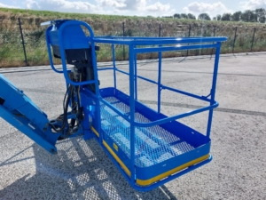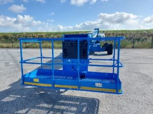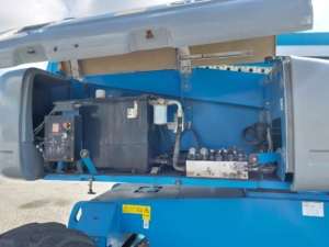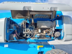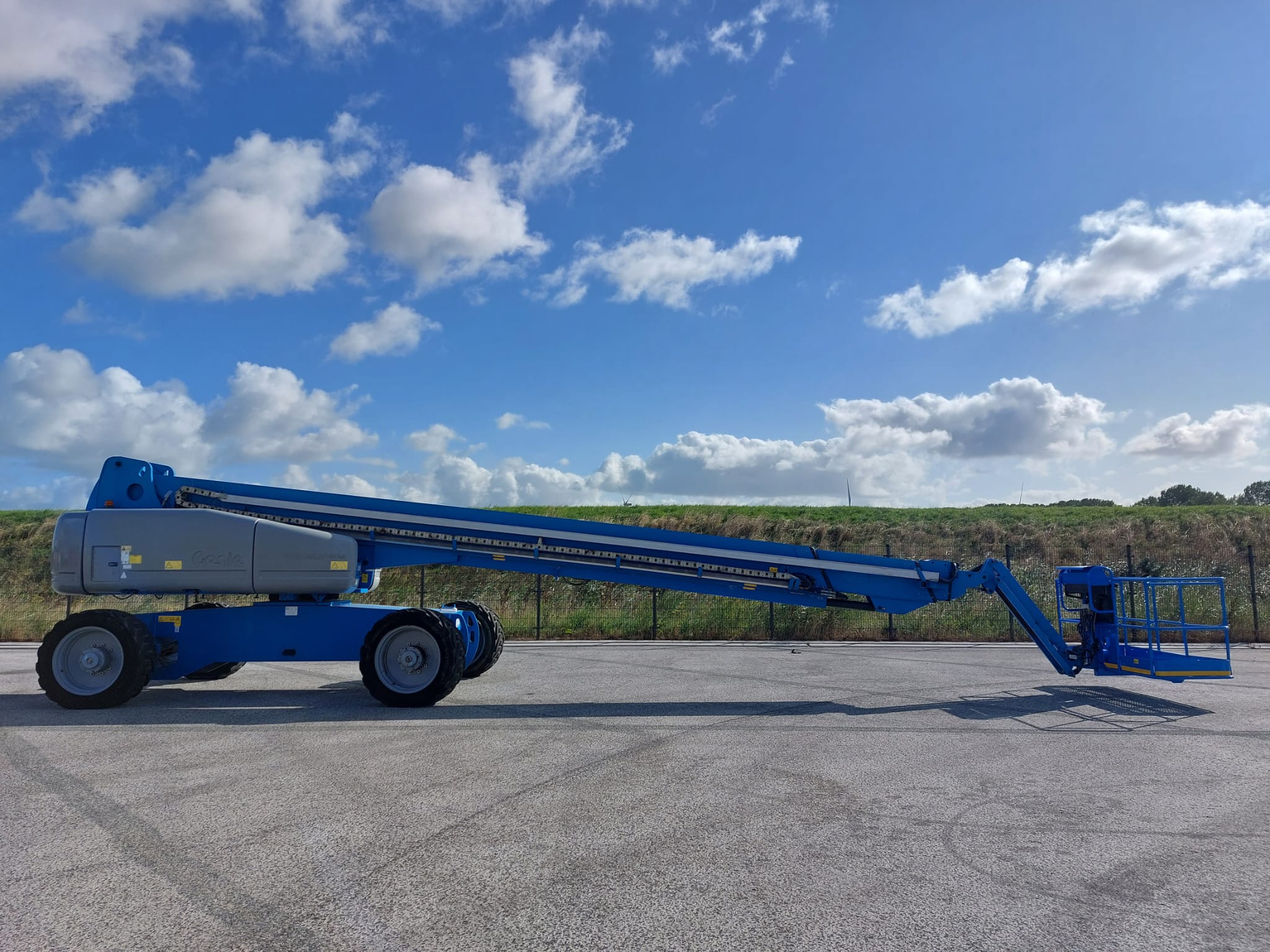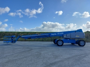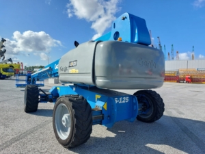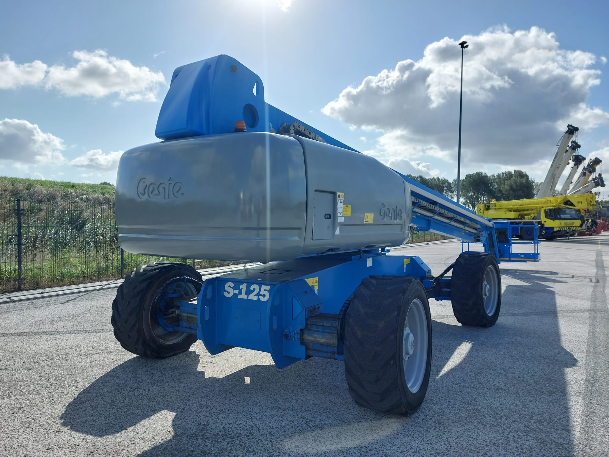 The Genie S-125 Super Boom is a large self-propelled telescopic boom with a working height of 131 ft 2 in (40.15 m), a horizontal reach of up to 75 ft (22.86 m), and a lift capacity of 750 lb (340 kg). It features a rugged diesel engine, four-wheel drive and steer, and foam-filled rough terrain tires.