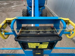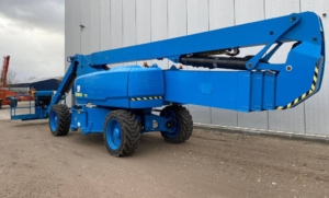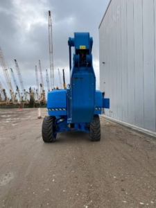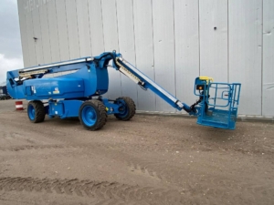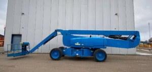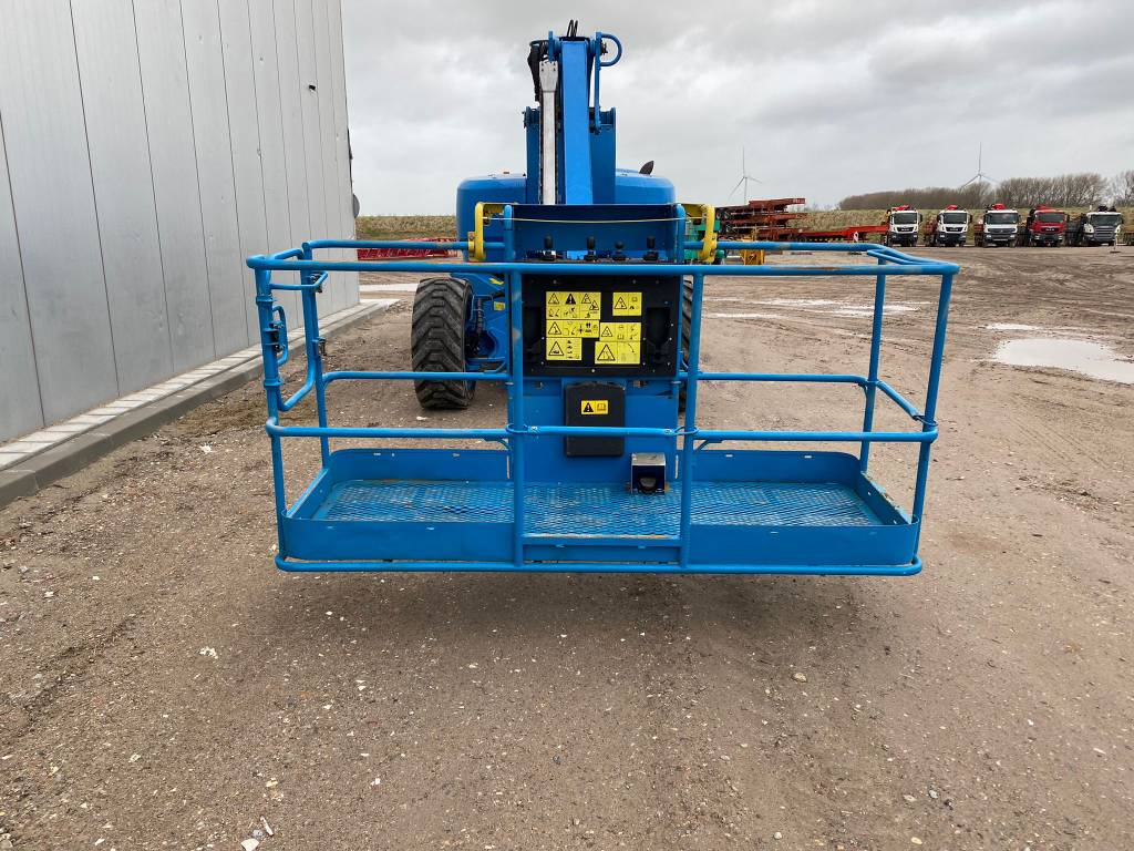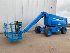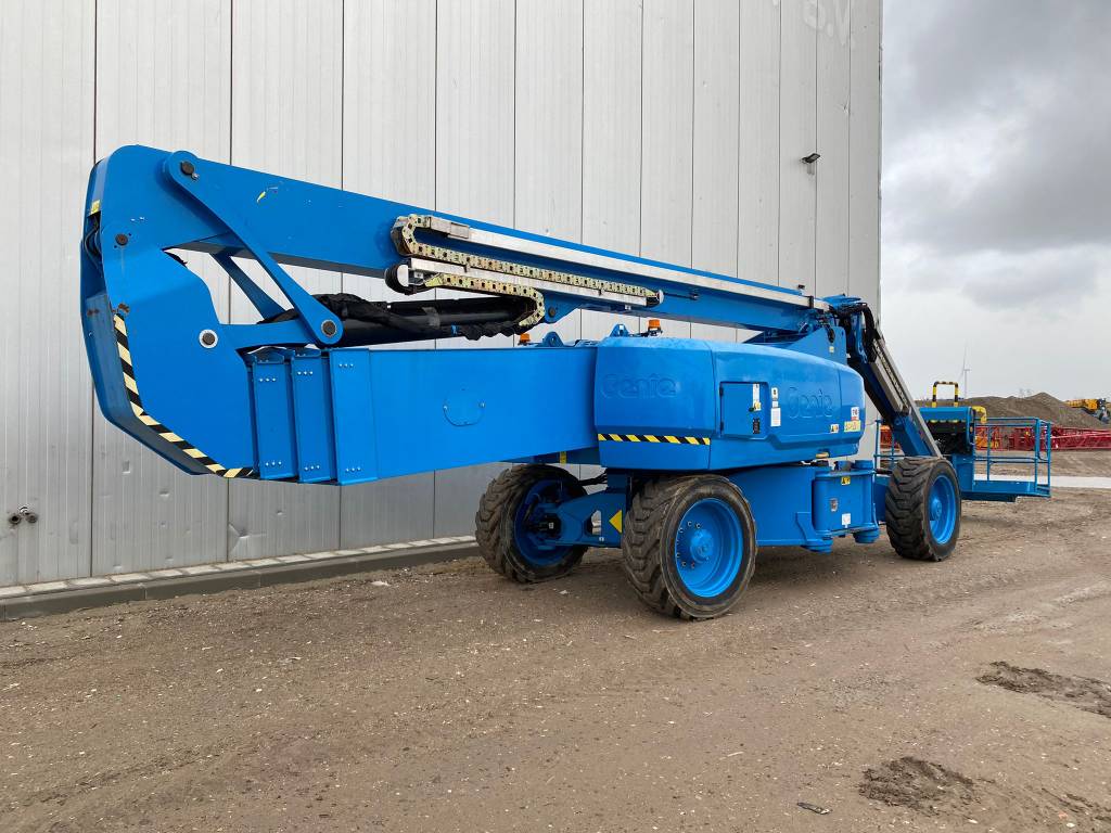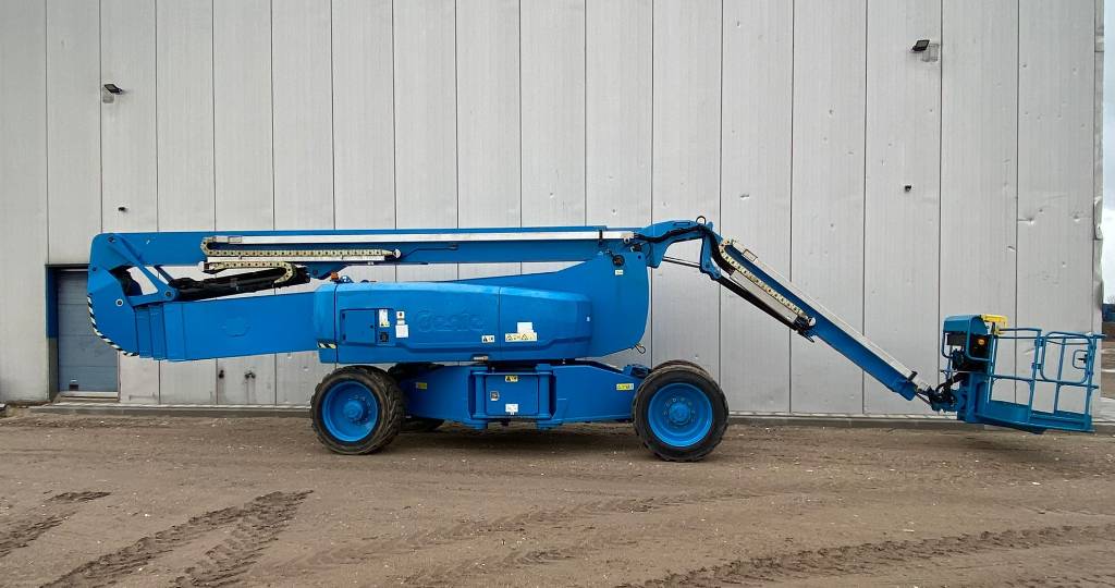 The Genie ZX-135/70 is an articulated boom lift with a maximum working height of 141 ft (43.15 m), a maximum horizontal reach of 69 ft 9 in (21.26 m), and a platform capacity of 600 lb (272 kg). It features a continuous 360˚ rotation turntable and a telescoping Jib-Extend® jib.