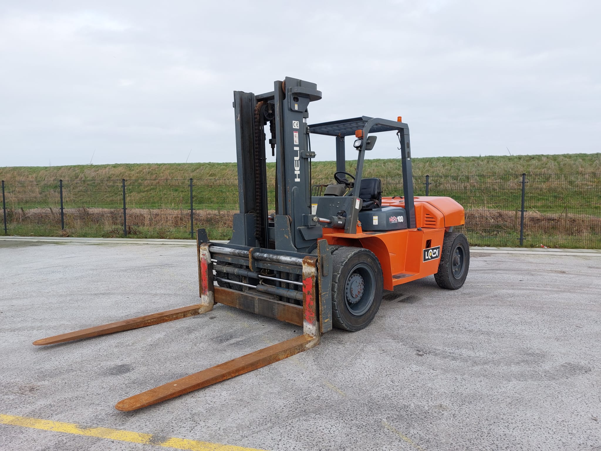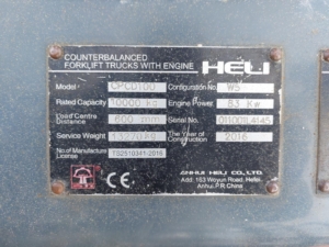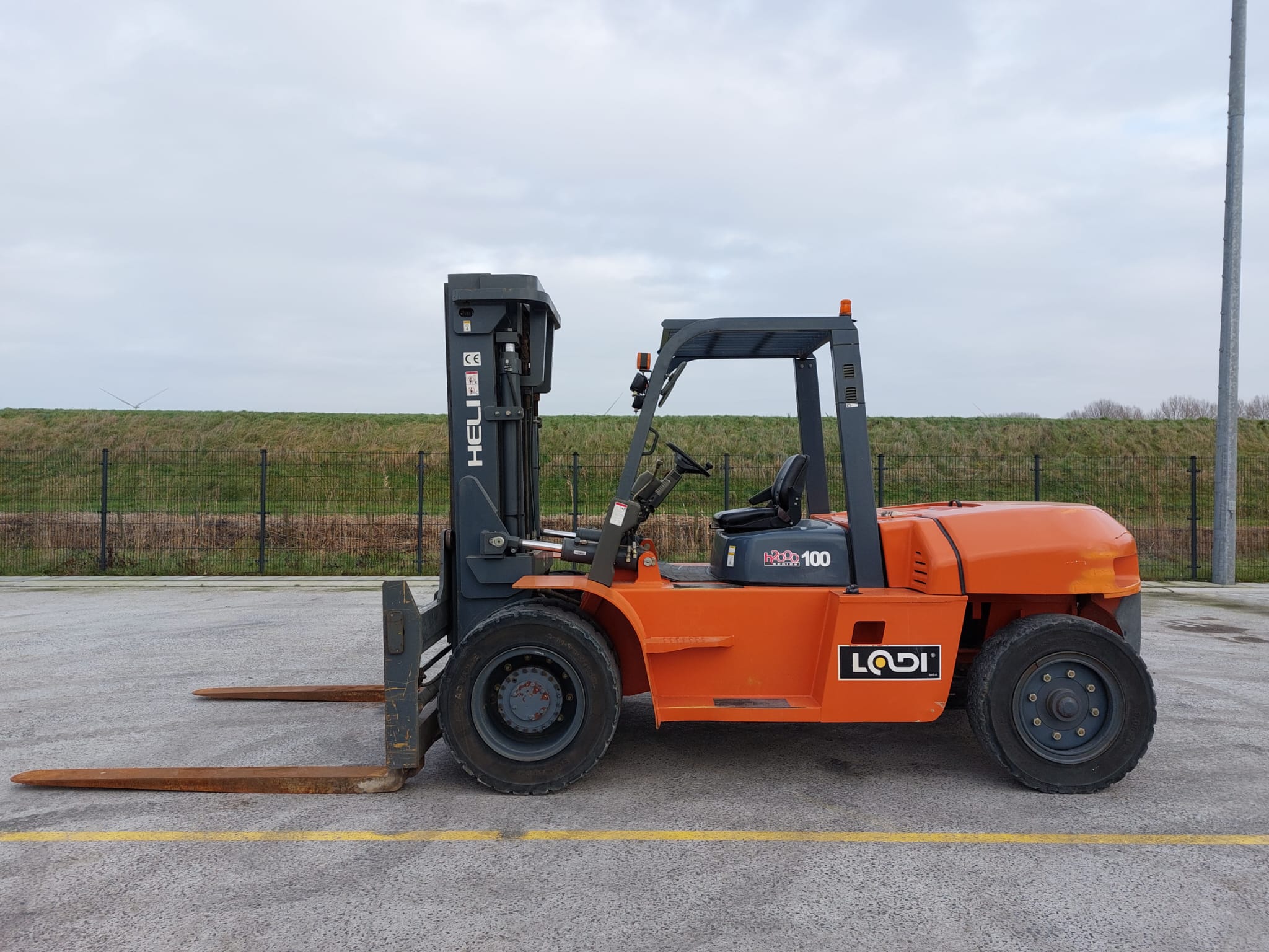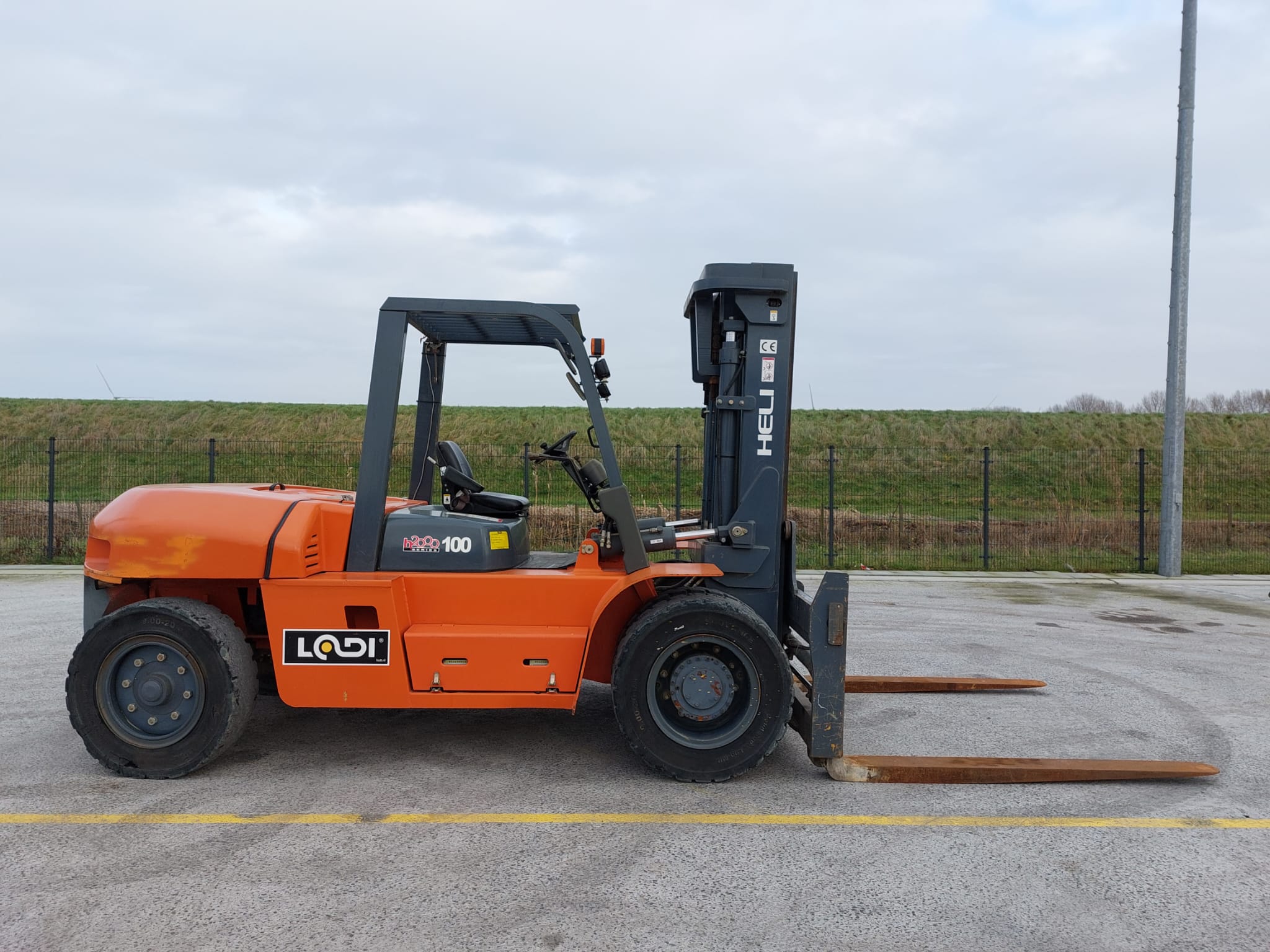 The Heli CPCD100 is a forklift (likely the CPCD100W4 model) with a load capacity of approximately 22,046 lbs, an operating weight of about 27,580 lbs, and a maximum speed of 18.7 mph.