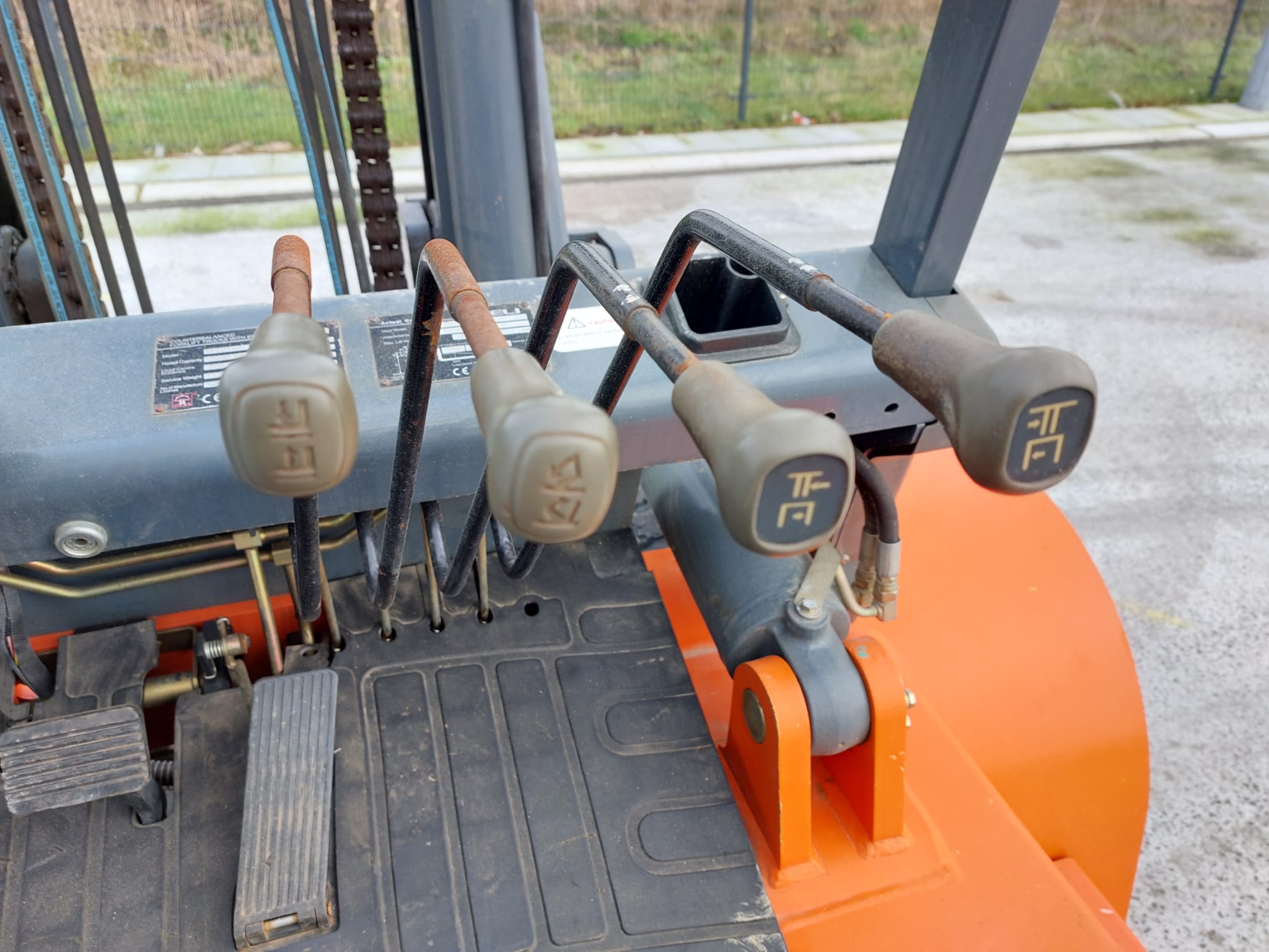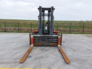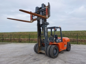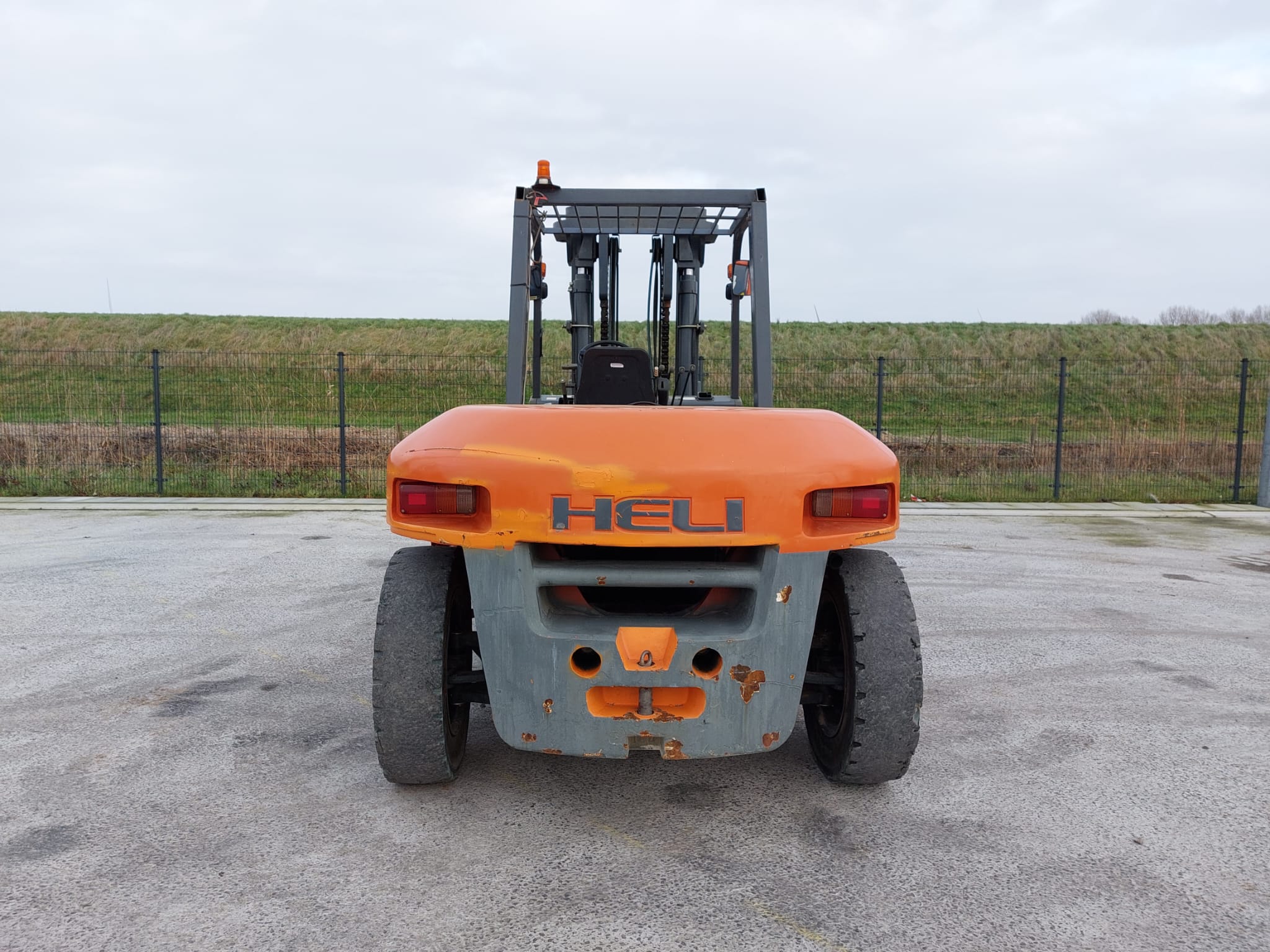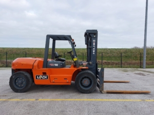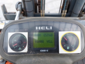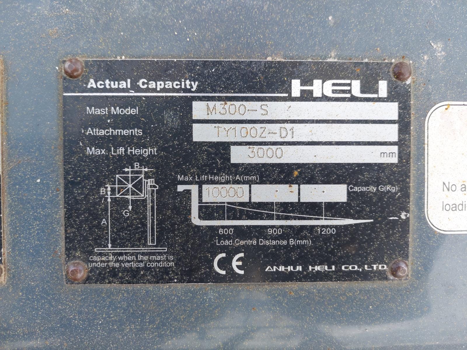 The Heli CPCD100 is a forklift (likely the CPCD100W4 model) with a load capacity of approximately 22,046 lbs, an operating weight of about 27,580 lbs, and a maximum speed of 18.7 mph.
