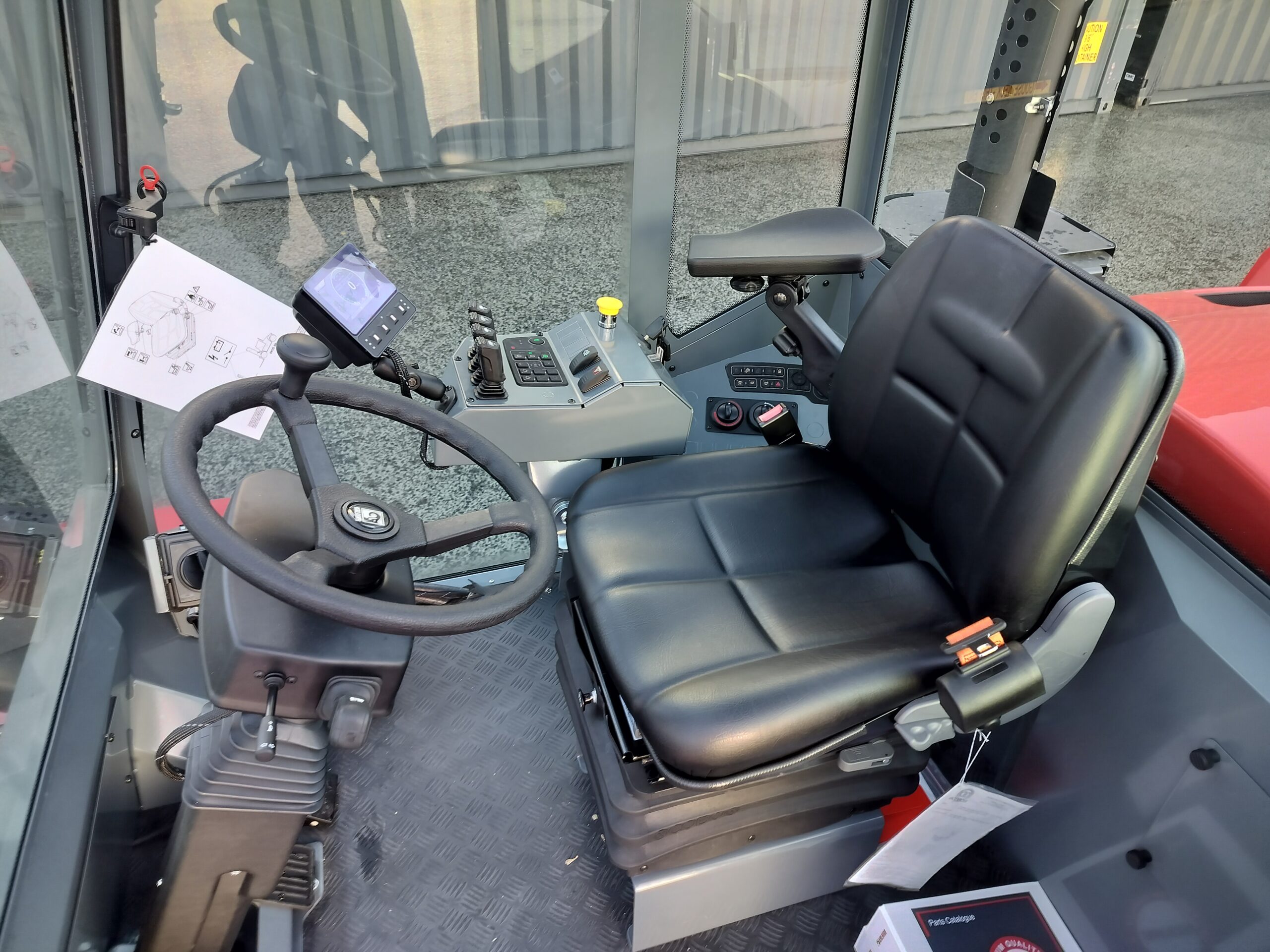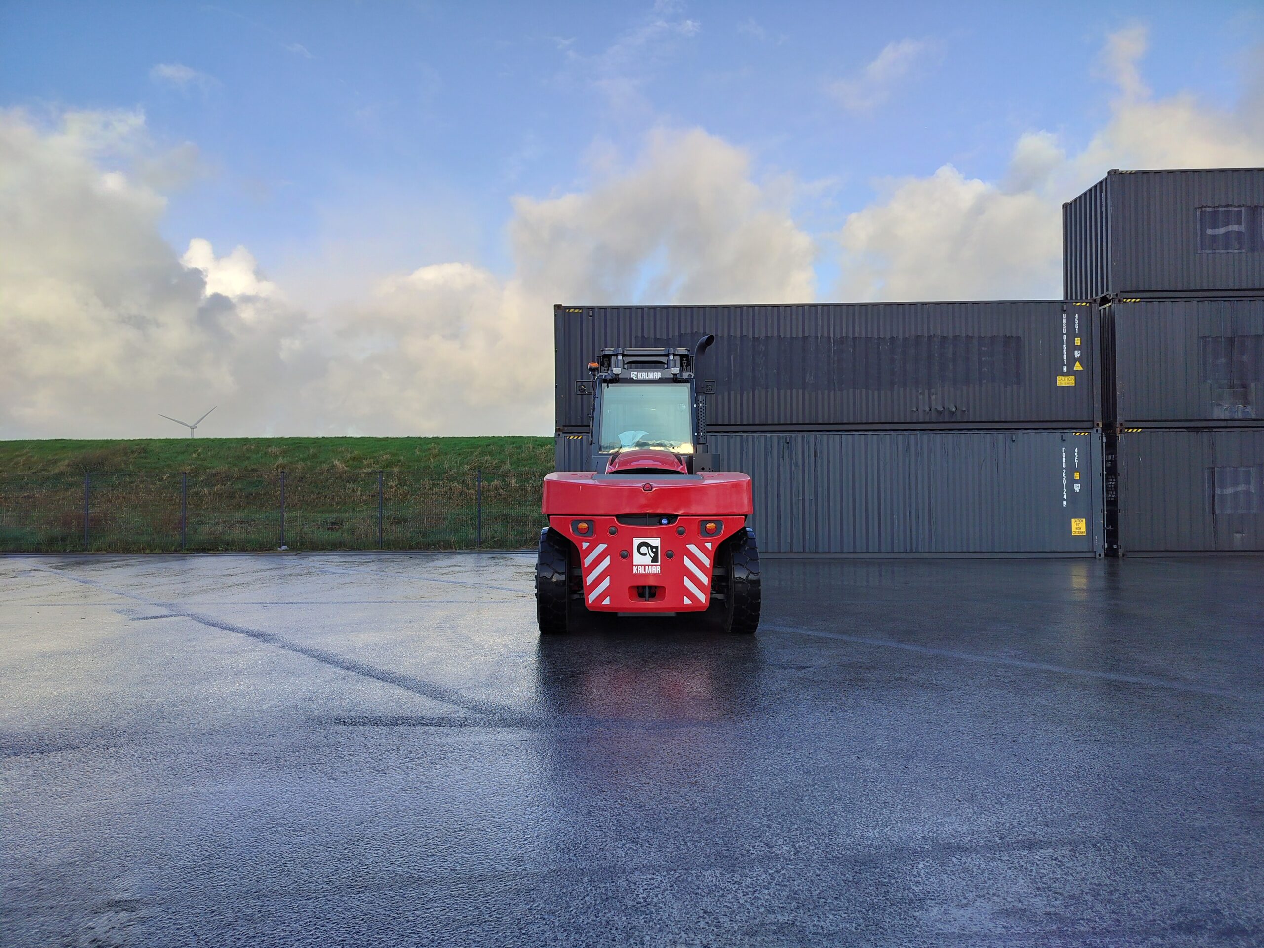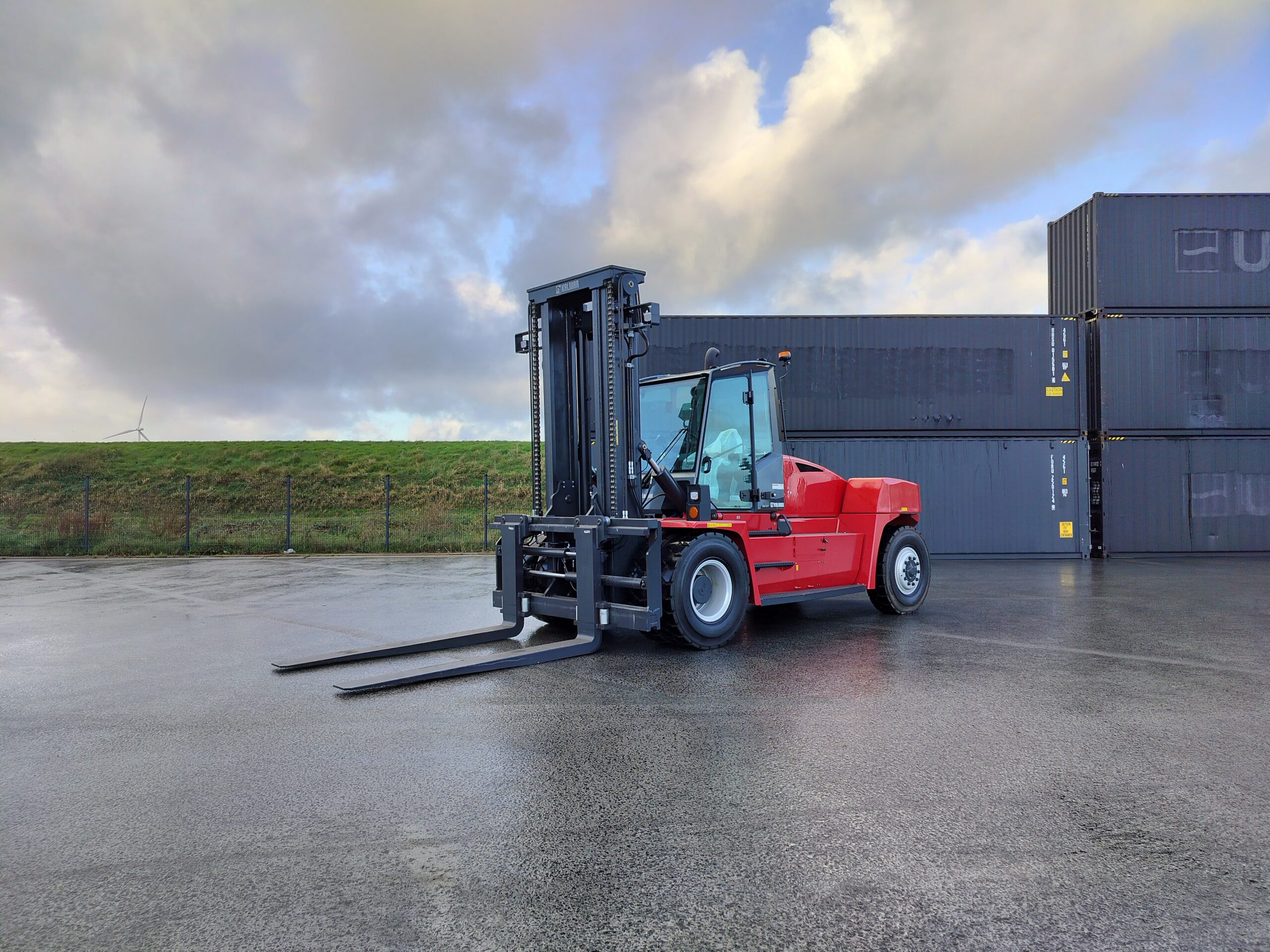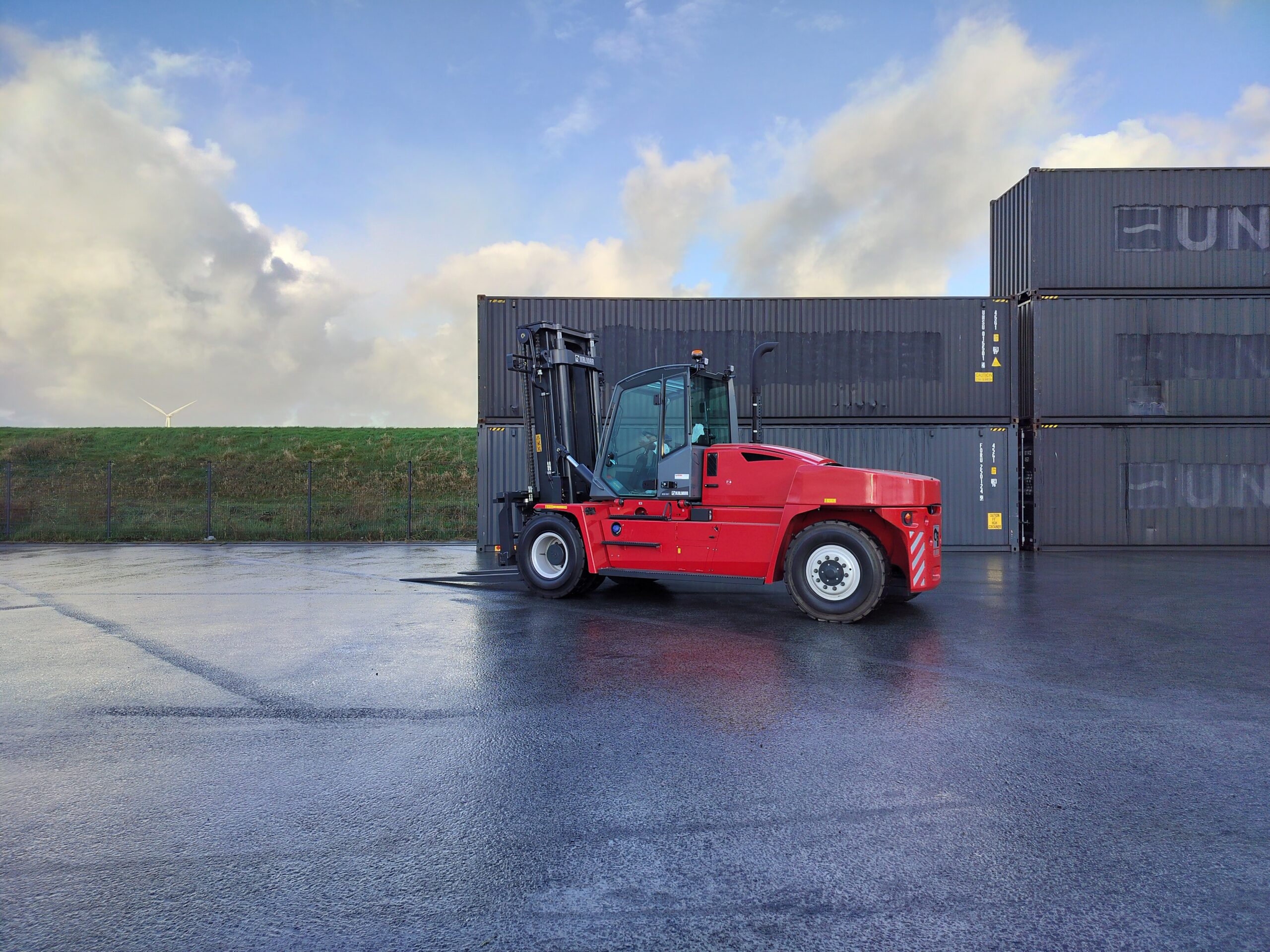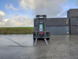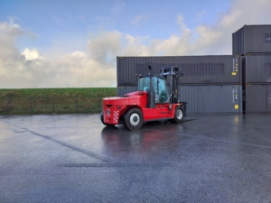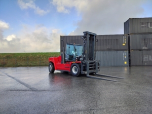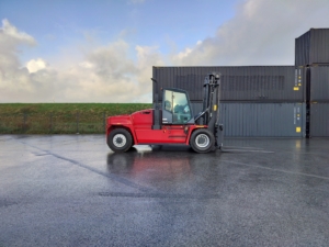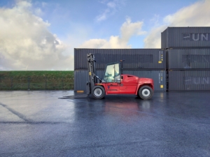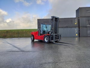 The Kalmar DCG160-12T is a heavy-duty forklift truck designed for demanding applications, typically featuring a lift capacity of 16 tons and known for its reliability and efficiency in handling containers and heavy loads.