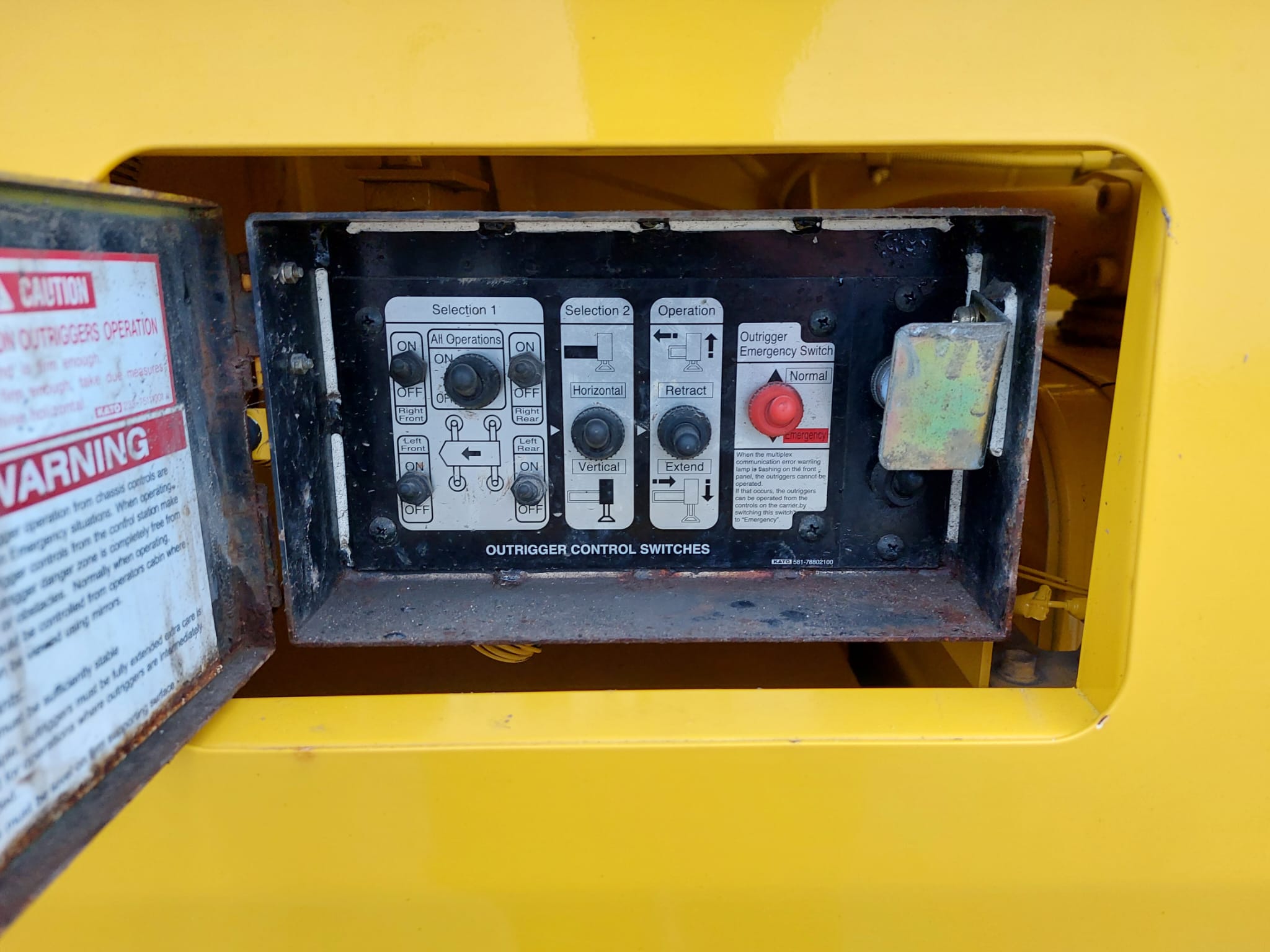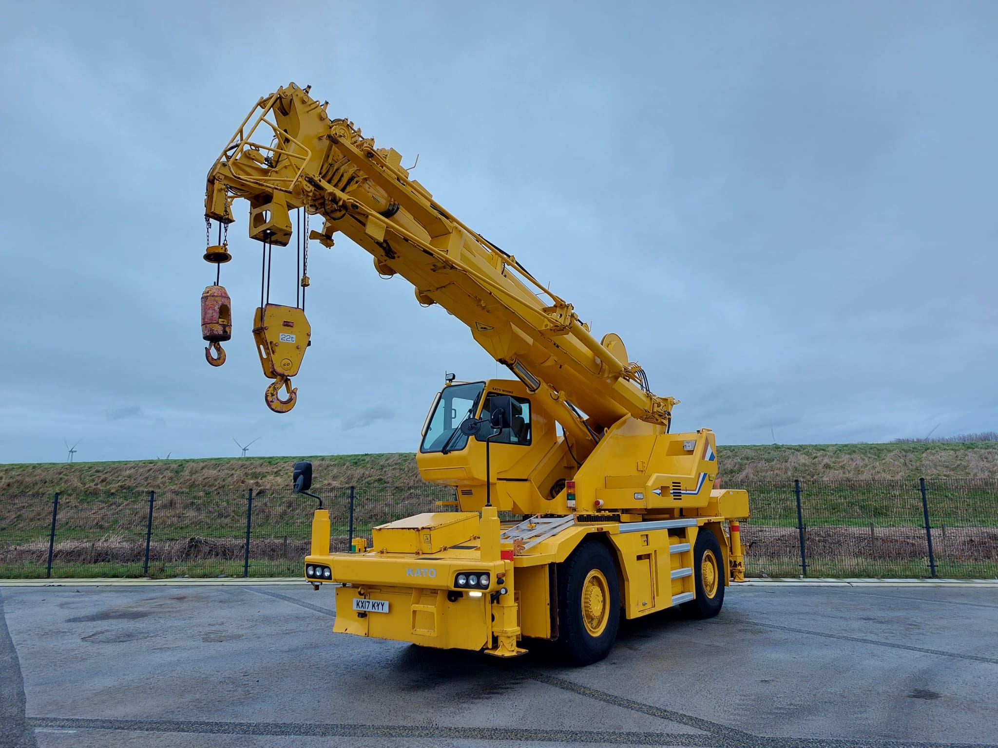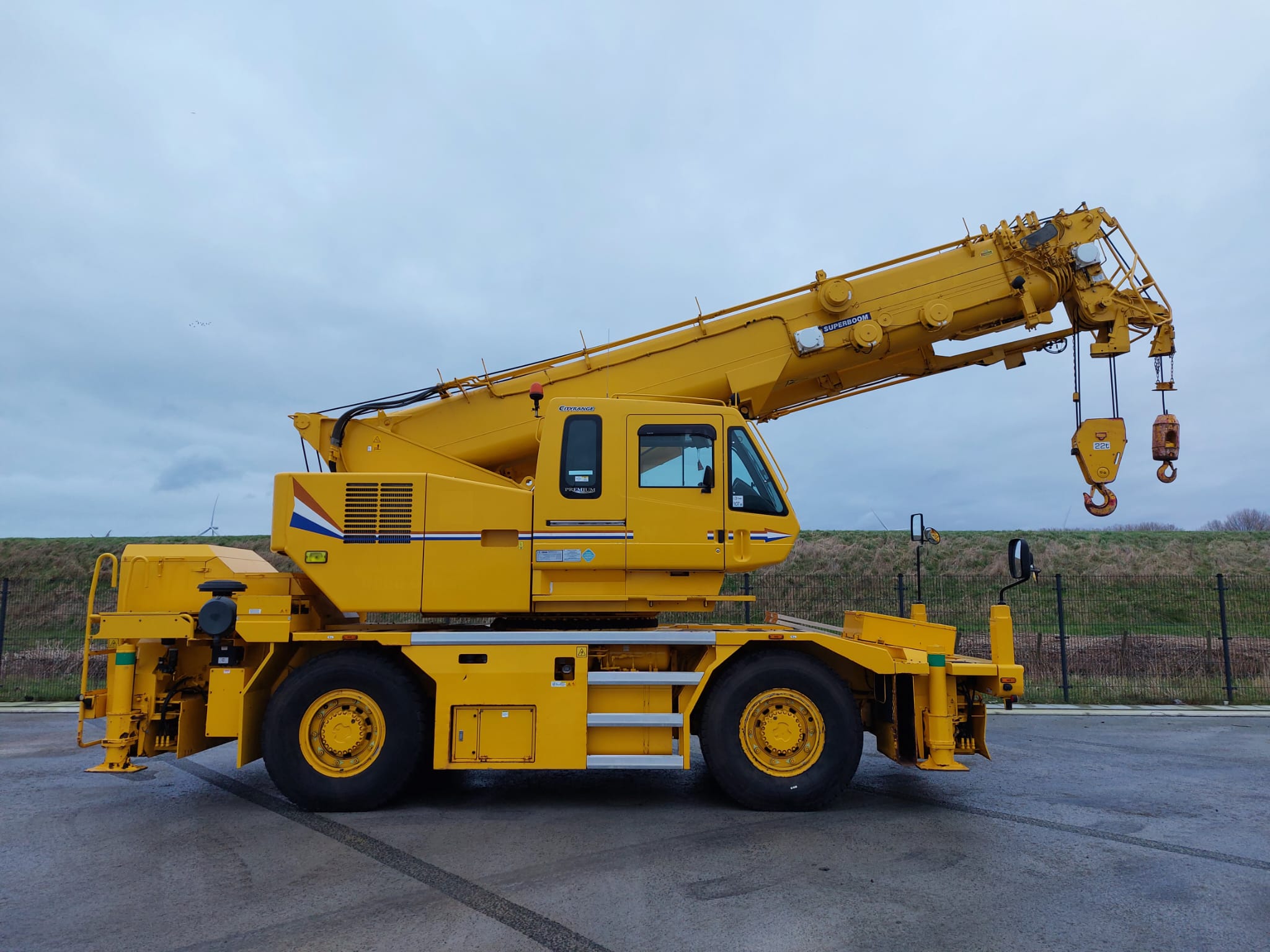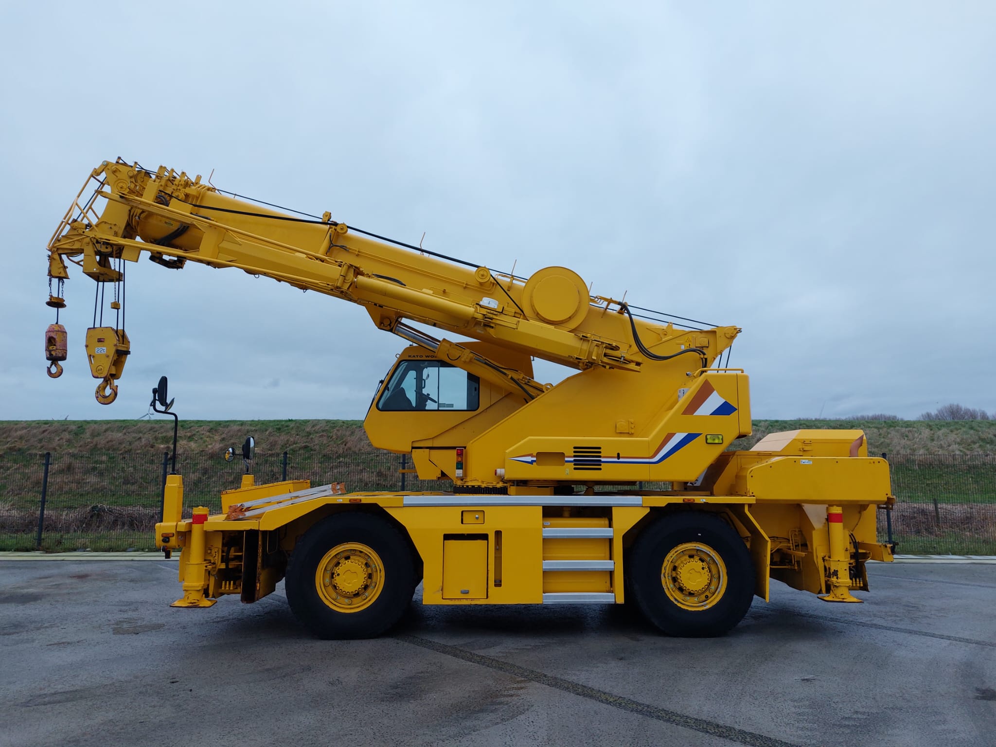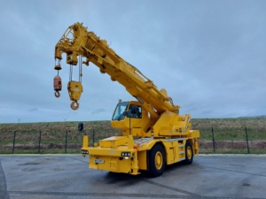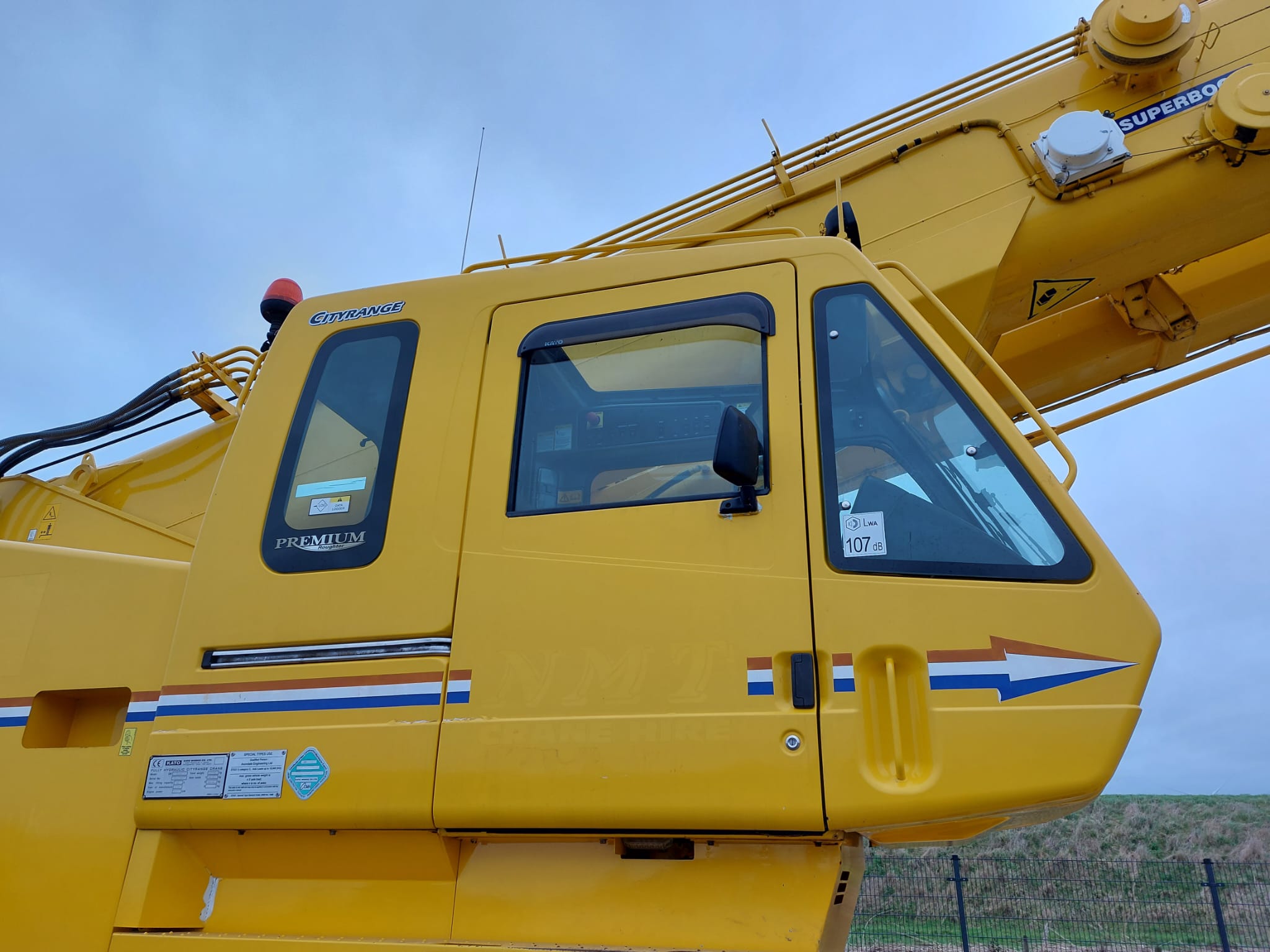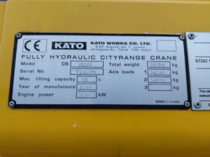 The KATO CR-350Ri is a City Range crane with a maximum lifting capacity of 35 tons x 2.6m and a maximum lifting height of 47.3m, featuring a 6-section SUPERBOOM and a 3-section SL Jib.
