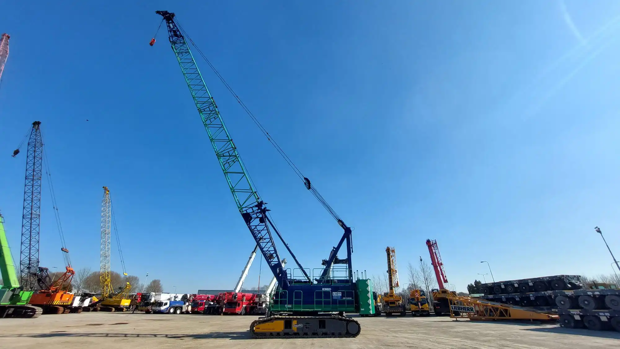 The Kobelco CKE1100G-2 is a hydraulic crawler crane with a maximum lifting capacity of 110 tons (121 US tons) and a maximum crane boom length of 70.1 meters (230 ft).