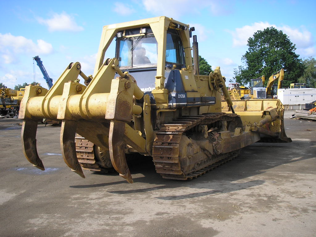 The Komatsu D135A-2 is a Crawler Tractor/Dozer with an operating weight of approximately 65,698 lbs (29,800 kg). It features a 289 hp engine (Model S6D140), a PS transmission with 3 forward and 3 reverse gears, and a ground clearance of about 1.5 to 2 feet.