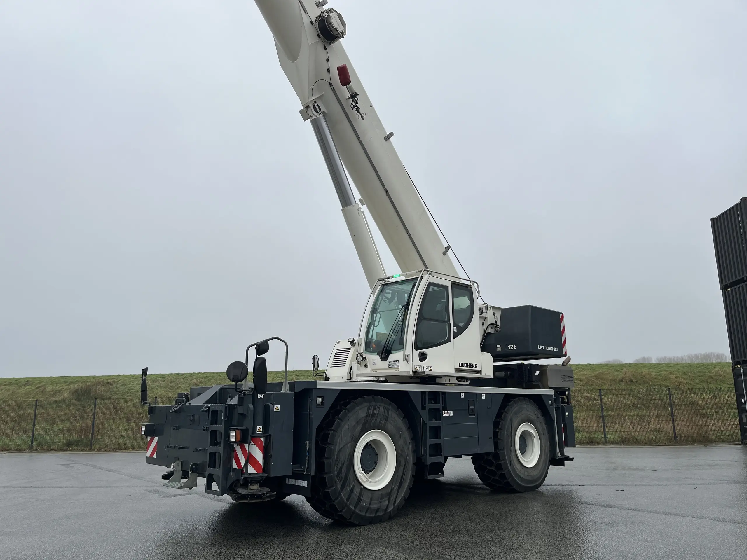 The Liebherr LRT 1090-2.1 is a rough terrain crane with a maximum load capacity of 90 t (100 US tons), a telescopic boom up to 47 m (154 ft), and features like VarioBase® support technology.