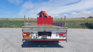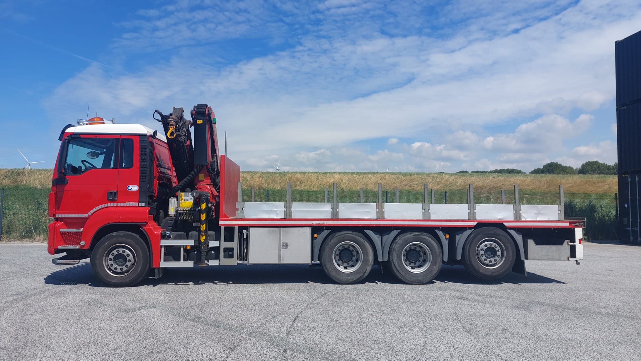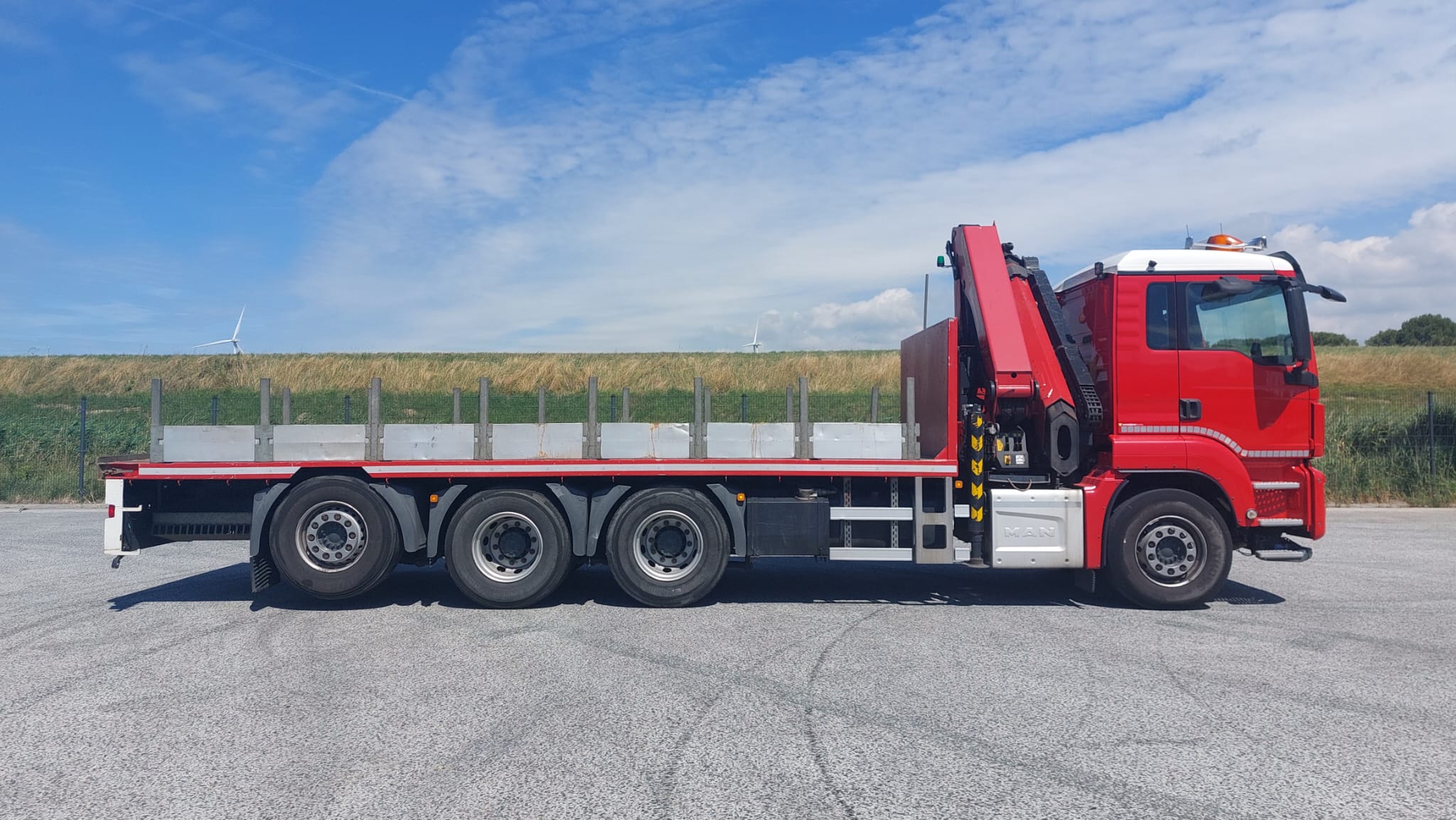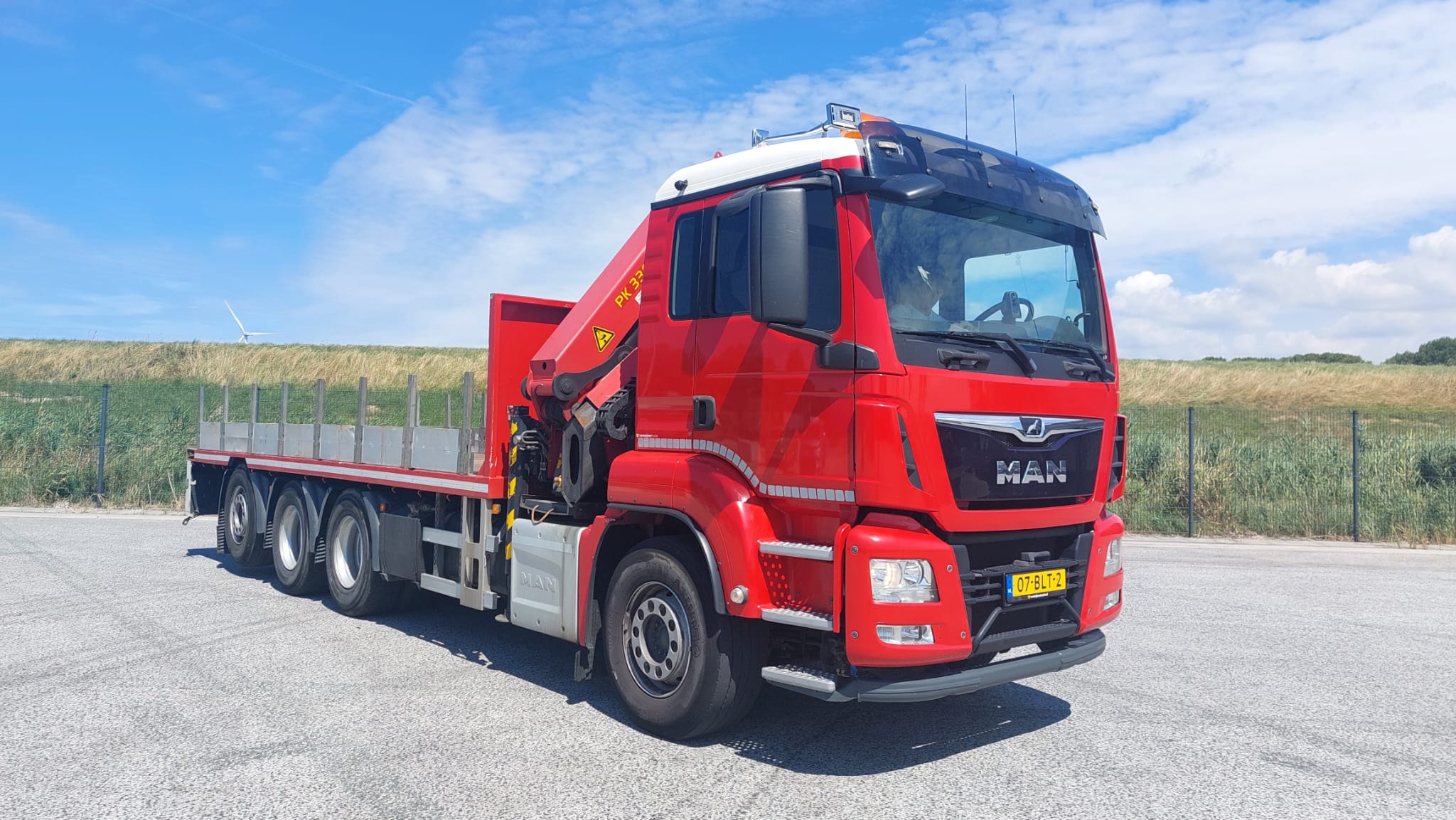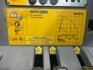 The MAN TGS 37.420 is a rigid chassis truck (8×4 drive type) with a 313.2 kW engine and a gross vehicle weight of 37 tons. It is equipped with a Palfinger PK 33002 EH High Performance knuckle boom crane, which has a maximum lifting moment of 30.0 mt (224940.0 ft lbs) and a maximum hydraulic outreach of 21.3 m (69′ 11″).