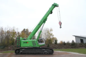The Sennebogen 6113 E is a versatile telescopic crawler crane with a maximum load capacity of 120 tons. It features excellent off-road mobility and a telescoping crawler undercarriage, making it suitable for demanding Pick & Carry tasks and providing an alternative to traditional cranes. Its maximum main boom length is 40.2 m, and the hook height can reach up to 67 m with extensions.