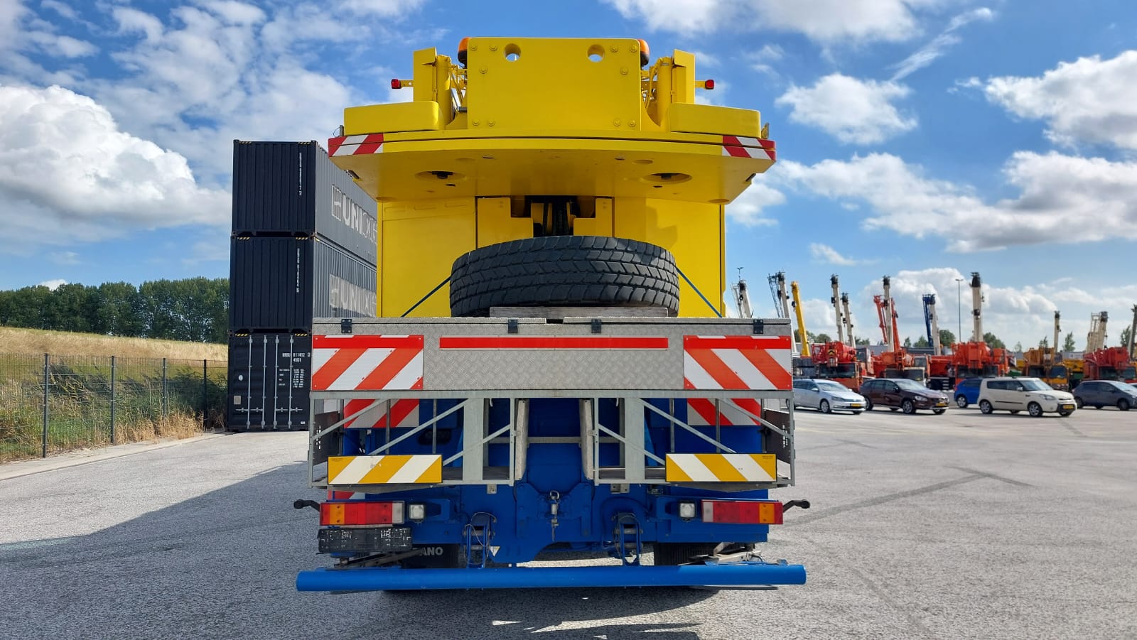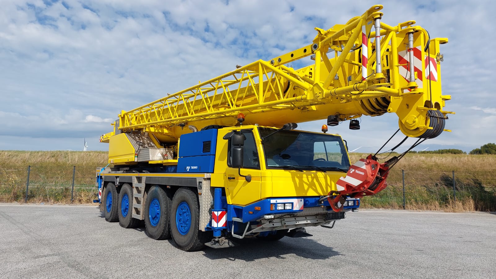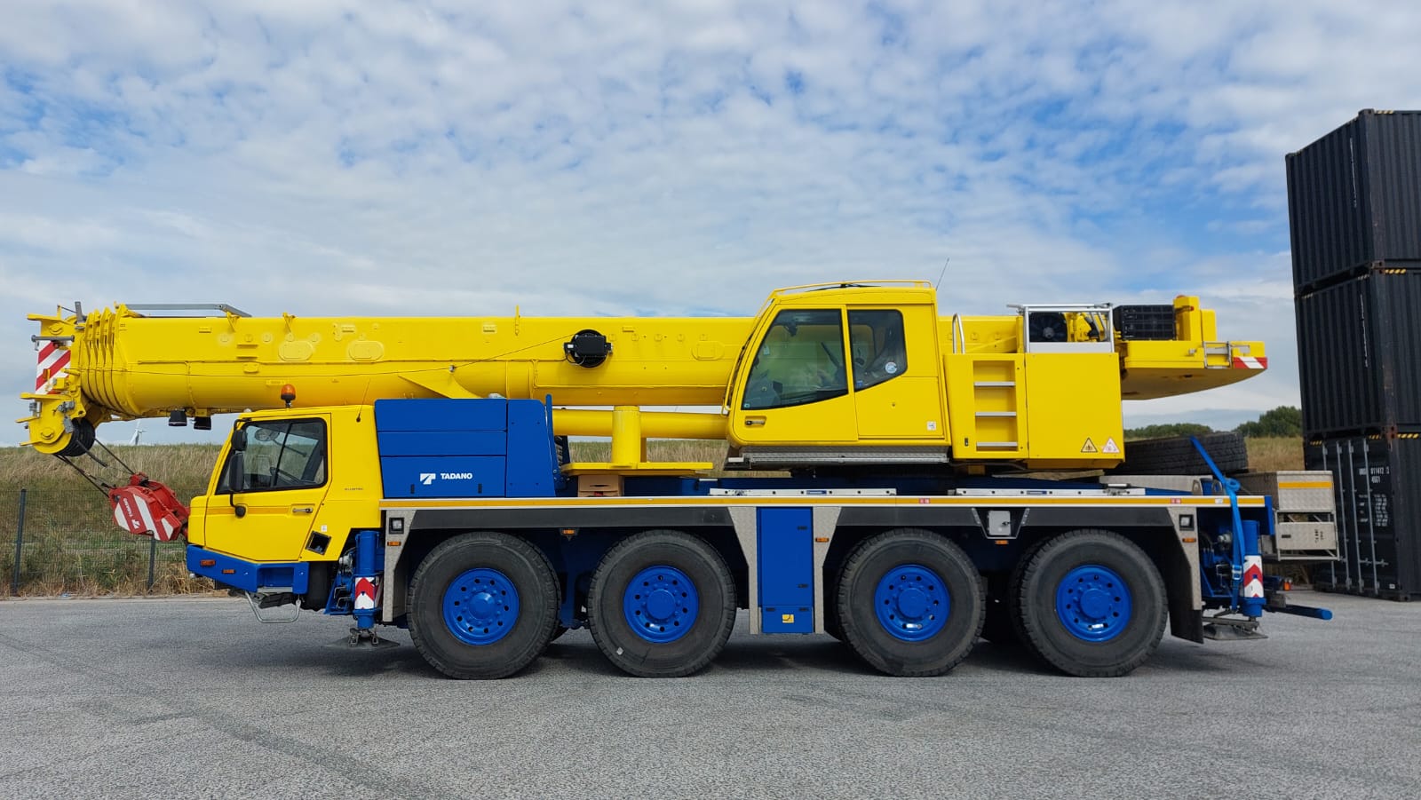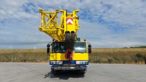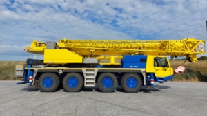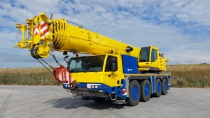 The Tadano ATF 100G-4 is an all-terrain crane with a maximum lift capacity of 110 tons, a maximum boom length of 168 feet, and is powered by a Mercedes-Benz 6-cylinder OM 470 LA Tier IV compliant diesel engine.