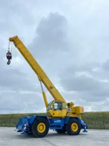 The Terex RT 555-1 is a dependable rough terrain crane with a maximum lifting capacity of 50 metric tons (55 U.S. tons), featuring a 4-section boom with a max length of 33.5 m (110 ft) and hydraulic powered outriggers for adaptability to any terrain.