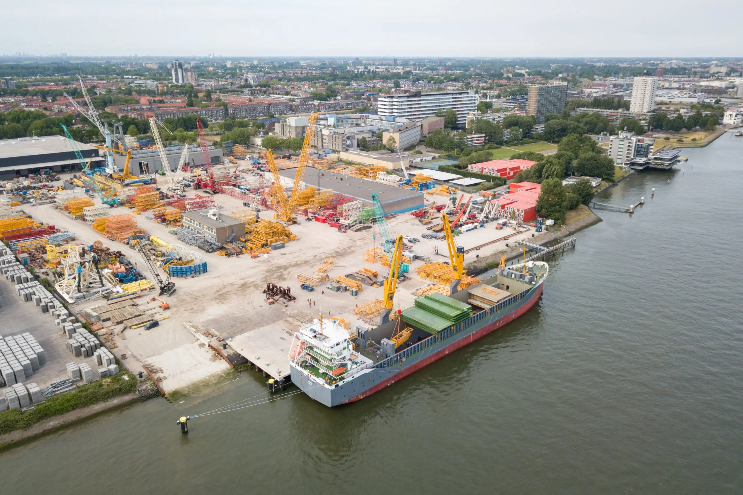 Our 140,000 m² heavy-lift terminal is strategically located along a 200-metre quay with a water depth of 9 metres, offering excellent access for maritime and inland shipping. The site is logistically optimized and fully equipped to support industrial projects from A to Z, with on-site offices, warehousing, construction facilities, port cranes, and a wide range of handling equipment.